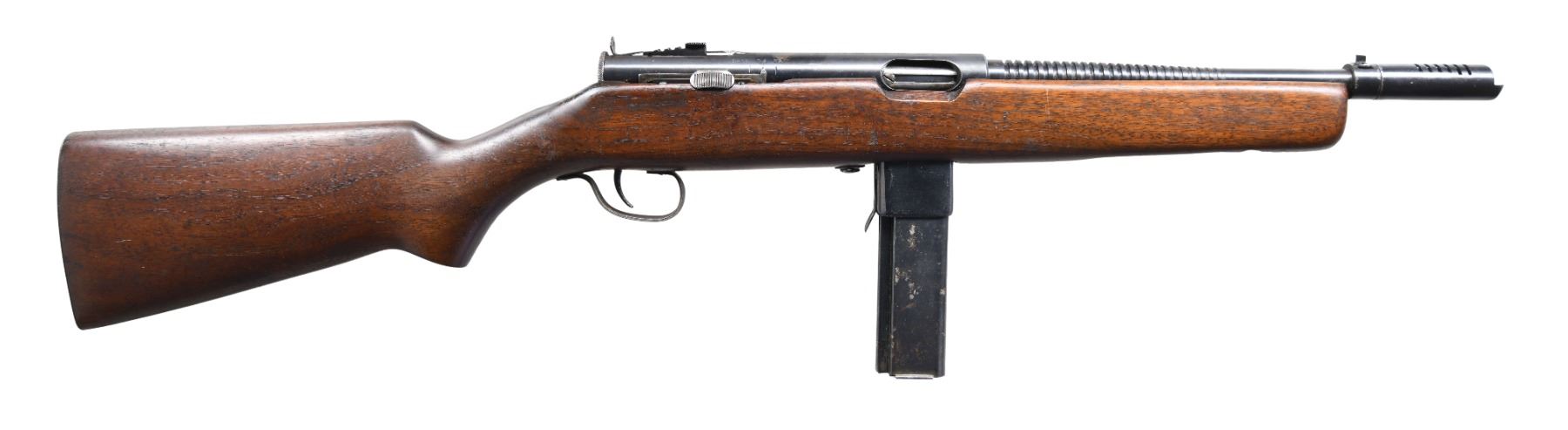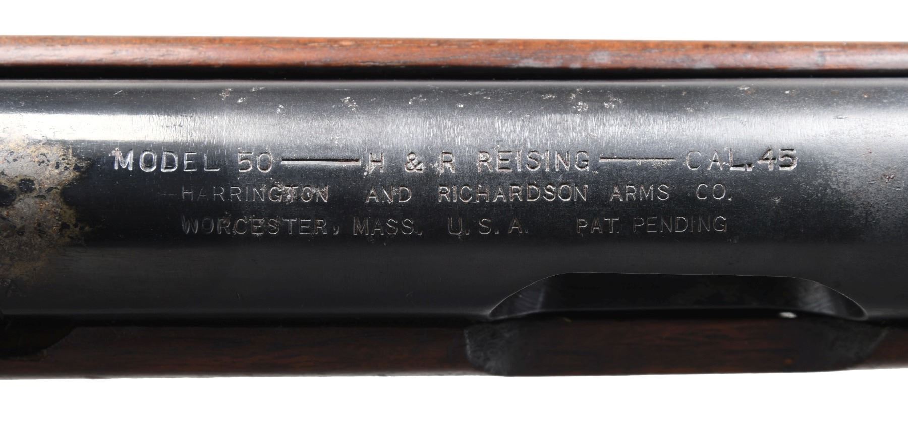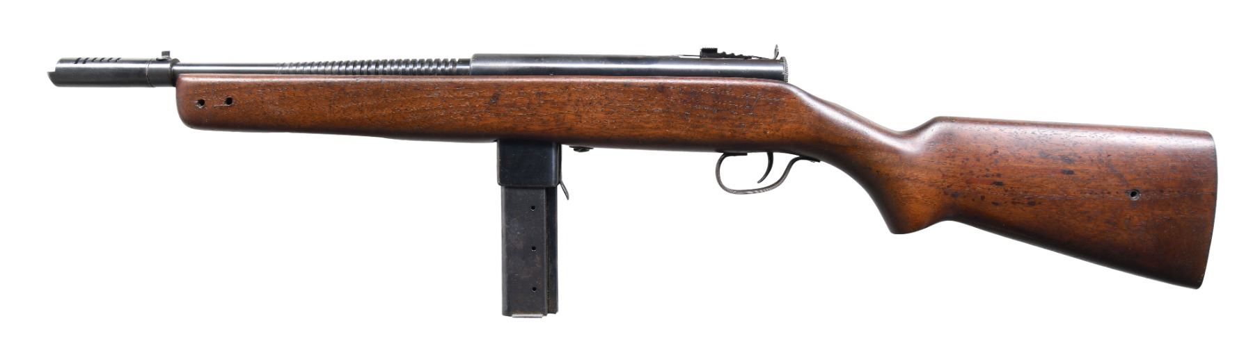 Cal. 45 ACP. S# 1994. Bbl. 13.5" over comp. Blued barrel w/ 24 fins. In a search for another compact SMG as things were heating up in Europe in 1939, Eugene Reising went to work designing what we would eventually know as the Reising Model 50. He received a patent on his compact, closed bolt carbine, chambered in .45ACP in June of 1940, and entered into a manufacturing contract with Harrington & Richardson to facilitate production. It didn't have many competitors, as the only similar firearm was the Thompson SMG, but the Reising Model 50 was extremely accurate since it fired from a closed bolt. After submission for testing with the US Army, it was not immediately accepted since its same closed bolt mechanism that provided superior accuracy had a tendency to malfunction when not cleaned and maintained regularly. Since the Thompson SMG faced a shortage, the United States Marine Corps adopted the Reising Model 50 with a parkerized finish, cooling fins, a muzzle device to assist with recoil and with select-fire capability. They then requested a modified version for the "Para Marines" that utilized a folding wire stock in a pistol grip design, and without the muzzle device. It was known as the Reising Model 55 and shared by the Tank crews. This example, the Model 50 is a select fire, closed bolt sub machine gun. It has a 20rd mag-well with 24 cooling fins and a 6 slot muzzle device. Exposed metal surfaces are finished in a dark bluing. Full length wooden stock w/ steel butt plate. Graduated elevation adjustable rear peep sight & drift windage adjustable front post sight incorporated into the muzzle device. Receiver is stamped on top "MODEL 50 – H.&R. REISING – CAL .45 / HARRINGTON AND RICHARDSON ARMS CO. / WORCESTER, MASS. U.S.A. PAT PENDING". MAGS: 2 factory blued 20rd. CONDITION: Finish is complete w/ some light thinning on high spots, in areas of mechanical intervention & a small area on top of receiver, just forward of rear sight. Stock illustrates some light impressions typical of rack earned wear on vertical racks storage. Stock has 3 holes on left side, coinciding w/ a typical side position for sling mounts. Bright bore w/ strong rifling. Fire control mechanism appears to function correctly when cycled by hand. NATIONAL FIREARMS ACT MG REQUIRING BATF TRANSFER BEFORE TAKING POSSESSION. FULLY TRANSFERABLE. (03-1765/JZ). CLASS III CURIO. $6,500-9,500.