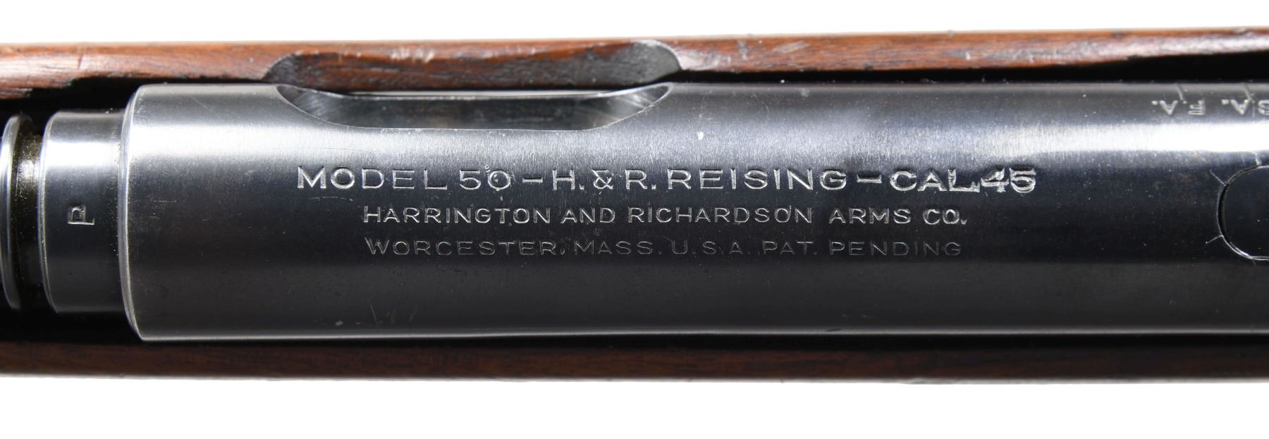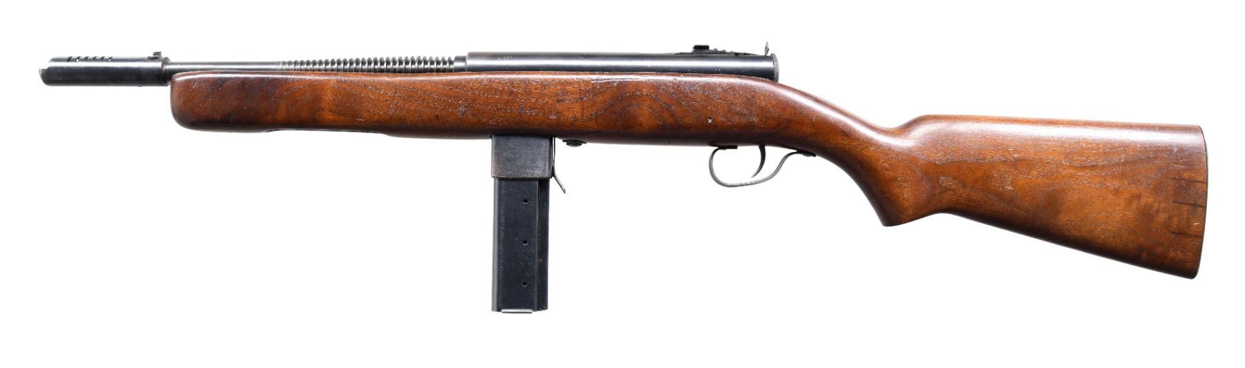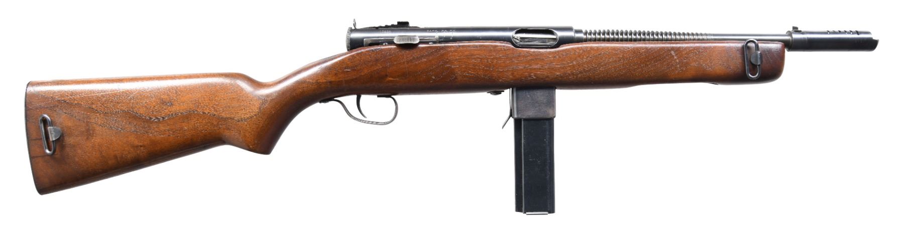 MACHINE GUN. Cal. 45 ACP. S# 17409. Bbl. 13.5" over comp. Blued barrel w/ 29 fins. In a search for another compact SMG as things were heating up in Europe in 1939, Eugene Reising went to work designing what we would eventually know as the Reising Model 50. He received a patent on his compact, closed bolt carbine, chambered in .45ACP in June of 1940, and entered into a manufacturing contract with Harrington & Richardson to facilitate production. It didn't have many competitors, as the only similar firearm was the Thompson SMG, but the Reising Model 50 was extremely accurate since it fired from a closed bolt. After submission for testing with the US Army, it was not immediately accepted since its same closed bolt mechanism that provided superior accuracy had a tendency to malfunction when not cleaned and maintained regularly. Since the Thompson SMG faced a shortage, the United States Marine Corps adopted the Reising Model 50 with a parkerized finish, cooling fins, a muzzle device to assist with recoil and with select-fire capability. They then requested a modified version for the "Para Marines" that utilized a folding wire stock in a pistol grip design, and without the muzzle device. It was known as the Reising Model 55 and shared by the Tank crews. This example, the Model 50 is a select fire, closed bolt sub machine gun. It has a 20rd mag-well with 29 cooling fins and a 6 slot muzzle device. Exposed metal surfaces are finished in a dark bluing. Full length wooden stock w/ right side sling swivels. Graduated elevation adjustable rear peep sight & drift windage adjustable front post sight incorporated into the muzzle device. Receiver is stamped on top "MODEL 50 – H.&R. REISING – CAL .45 / HARRINGTON AND RICHARDSON ARMS CO. / WORCESTER, MASS. U.S.A. PAT PENDING". MAGS: (3 total) 1 factory blued 20rd.& 2 blued 30 rd. CONDITION: Finish is complete & consistent w/ some light thinning on high spots & in areas of mechanical intervention. Stock illustrates some light scratches and impressions typical of rack earned wear w/ guns stored in vertical racks. Bright bore w/ strong rifling. Fire control mechanism appears to function correctly when cycled by hand. NATIONAL FIREARMS ACT MG REQUIRING BATF TRANSFER BEFORE TAKING POSSESSION. FULLY TRANSFERABLE. (03-1763/JZ). CLASS III CURIO. $6,500-9,500.