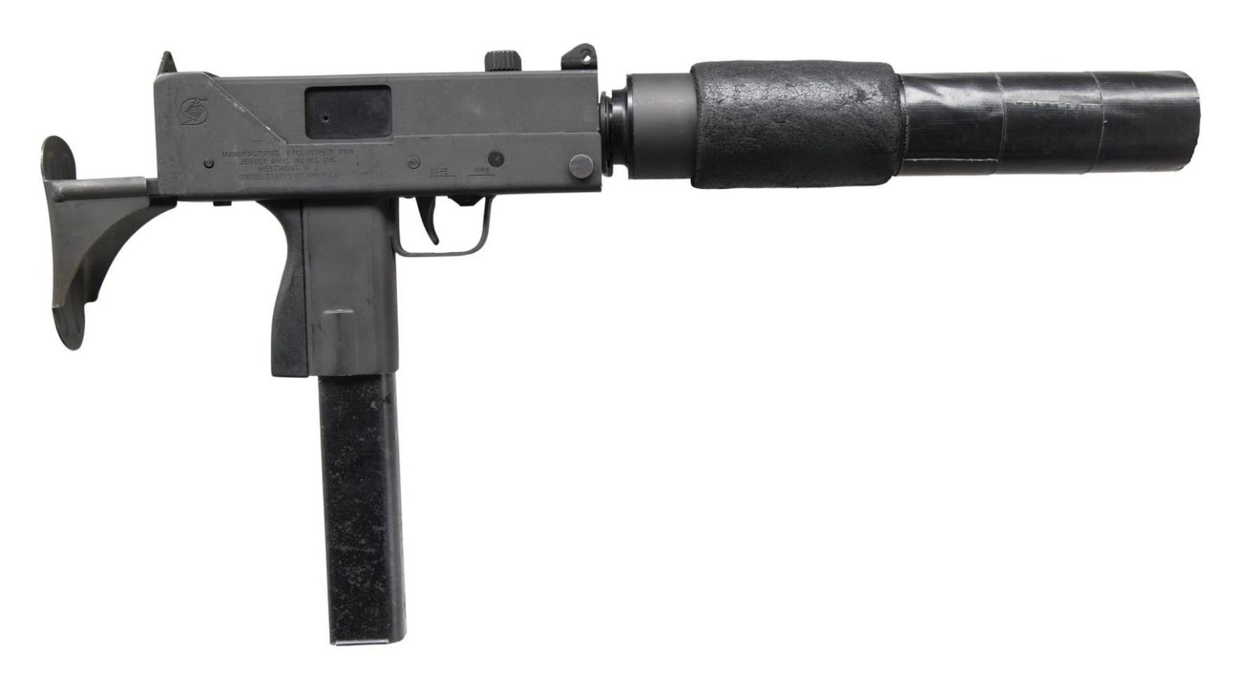 INDUSTRIES, (S-701-SMG) WITH SUPPRESSOR. Cal. 45. S# 820101464 (SMG) / D491 (Suppressor). Bbl. 6". There are very few firearms that conjure up the imagination of the general public more than the mere mention of the MAC 10. The Ingram Model 10 was originally designed in 1964. It would become the first of many small, simplistic SMGs to contrast with the expensive & labor-intensive earlier variants, such as the Thompson & Reising M50. Ingram’s two basic guidelines while designing the Model 10 were “simple and cheap” while remaining effective and reliable. Made famous mostly by Hollywood, the M10 made appearances on the silver screen & on television, eventually earning the infamous title of “The Gun That Made the 80’s Roar”, starting w/ John Wayne utilizing a suppressed 9mm M10 in the 1974 movie “McQ”. A favorite example used by the organized anti-gun movement, the Mac 10 was eventually, incorrectly, & inaccurately synonymous w/ every crime committed for a long period of time. Here we have an Ingram variant known to collectors as the "New Jersey MAC". It was originally manufactured by Jersey Arms Works as a copy of the Ingram Model 10, starting in 1982. It was called the "Avenger Commando" and was built during the time they were concentrating on making pistols, as opposed to SMGs, because it was a much larger market. They used unaltered M3 "Grease Gun" magazines, which were an attractive feeding device both in price & availability. Originally making only 143 full automatic SMGs, the remaining 377 units were sold to Wayne Daniel of SWD Inc., where the Cobray logo was added to the right side of the frame. Chambered in 45 ACP. Protected post fixed front sight & rear peep sight that is integral w/ the receiver. Select fire, open bolt, and blowback action. Selector on the left side of the receiver. Safety inside the trigger guard. MAGS: 1 steel 30 rd. grease gun mag. UNATTACHED ACCESSORIES: original SWD sound suppressor. CONDITION: exposed metal surfaces enjoy a parkerized finish w/ complete coverage throughout. Typical handling marks consist of scratches & thinning in areas of mechanical intervention. The collapsible wire stock locks tightly in the open position. Bore is clean w/ strong rifling. Fire control mechanism appears to function correctly when cycled by hand. NATIONAL FIREARMS ACT SMG & SUPPRESSSOR, EACH REQUIRING BATF TRANSFER BEFORE TAKING POSSESSION. FULLY TRANSFERABLE. (03-1679 & 03-1680/JZ). MODERN. CLASS III. $8,000-12,000.