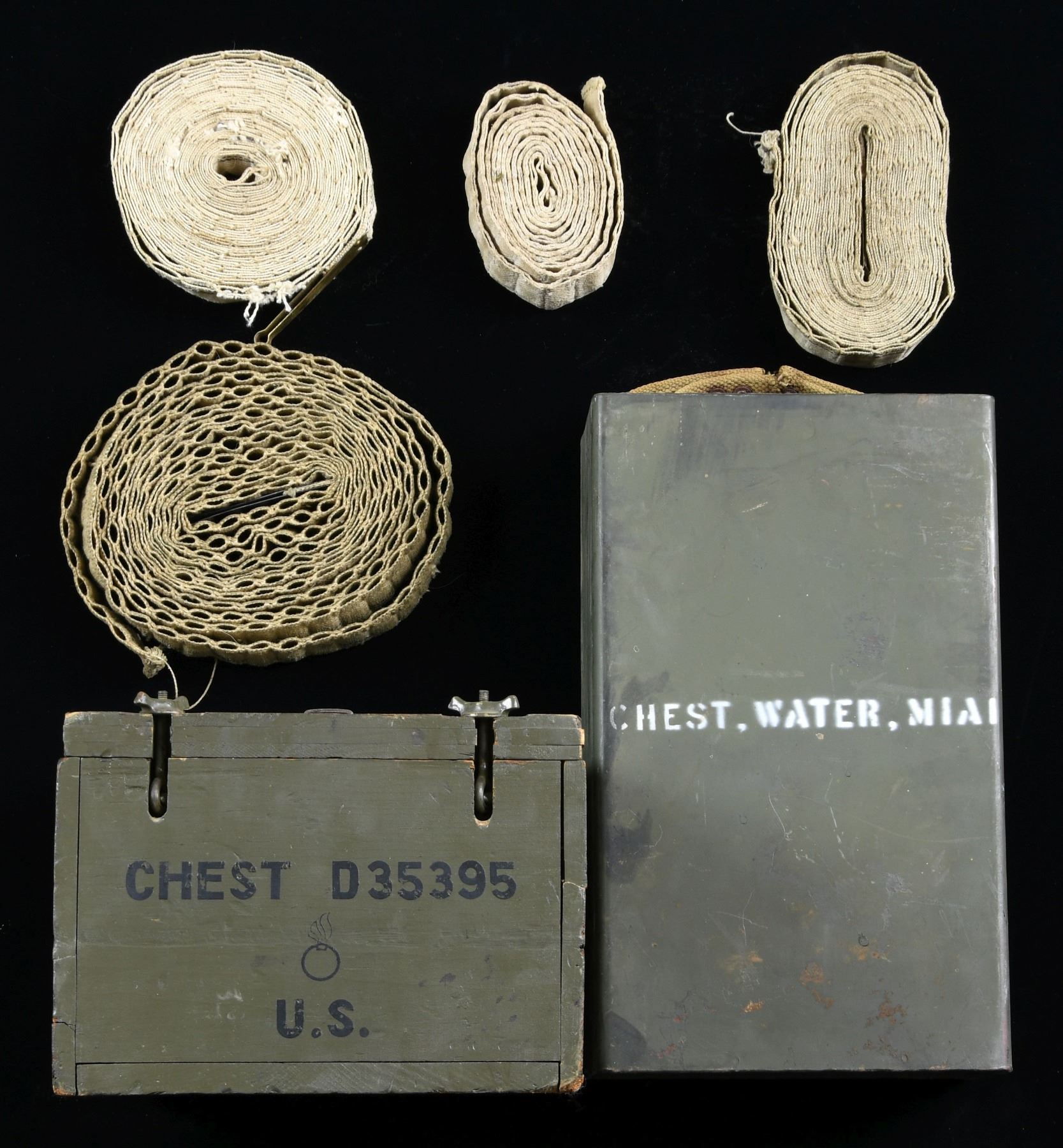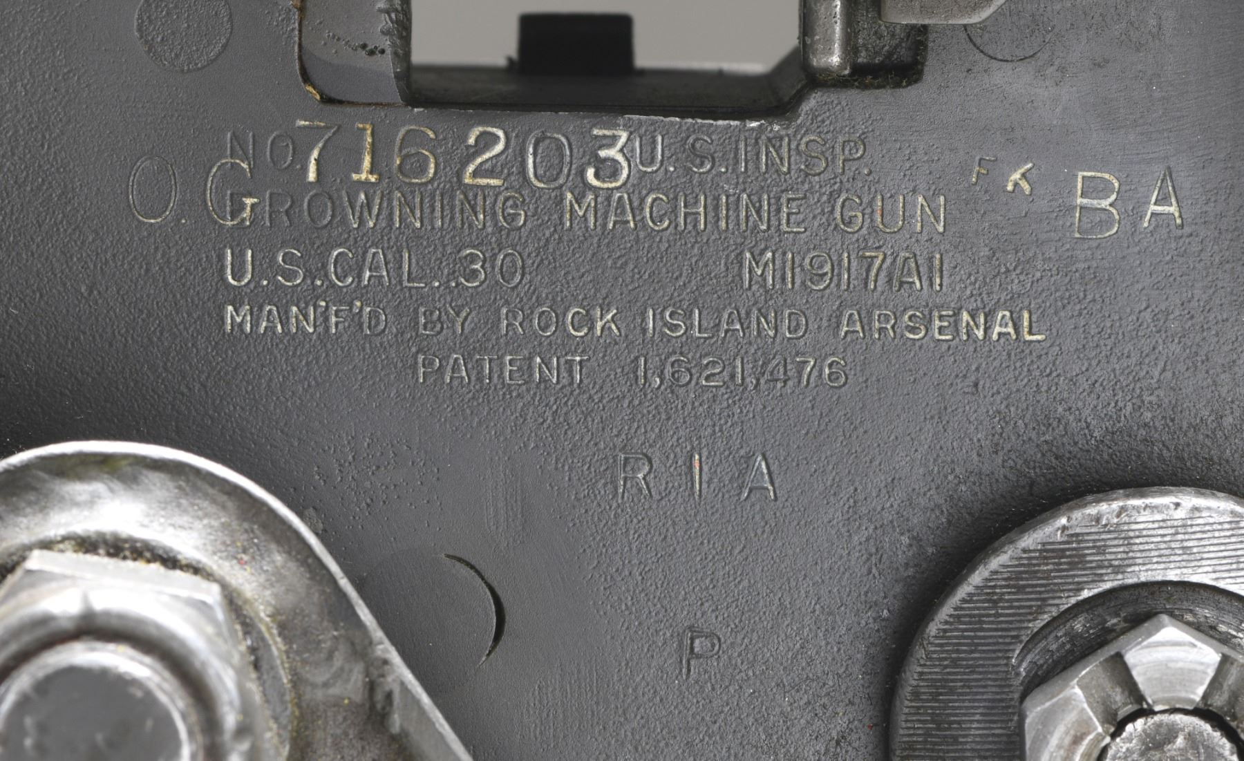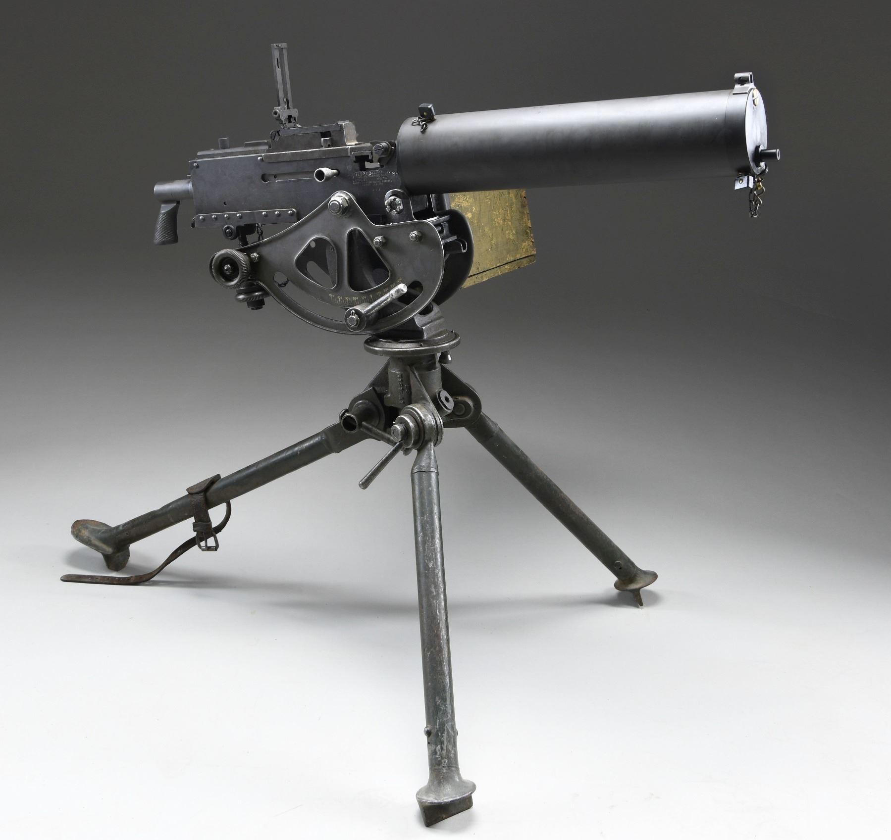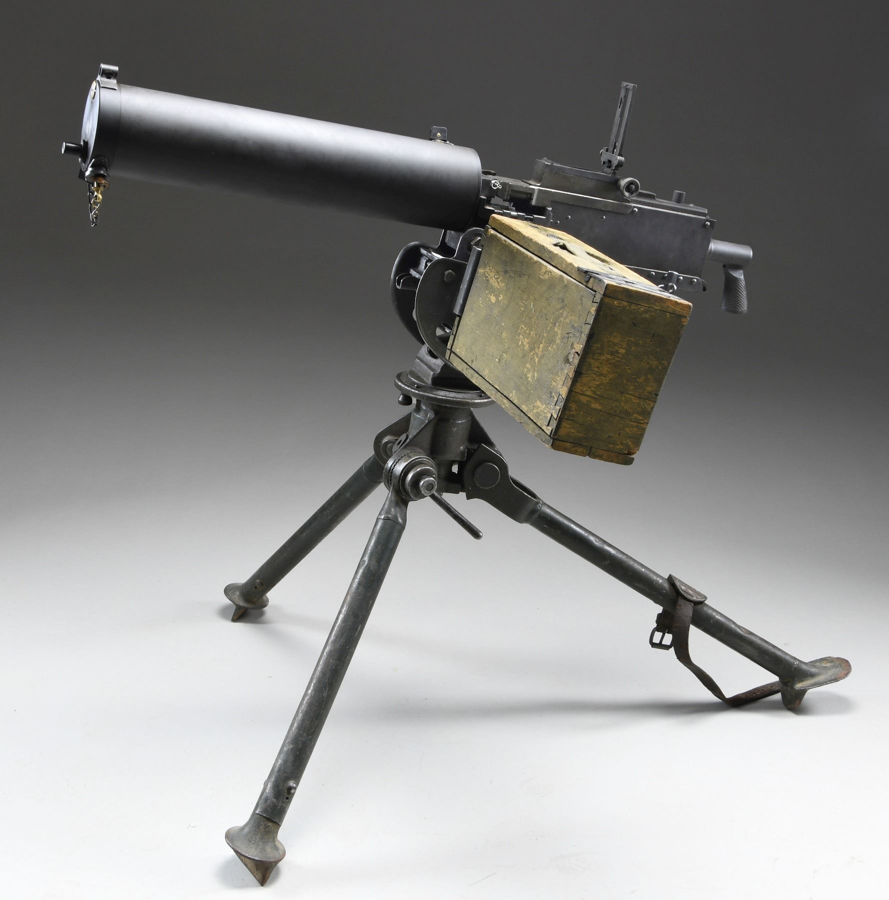 BROWNING MODEL1917A1 WATER COOLED MACHINE GUN ON TRIPOD. CURIO. Cal. 30-06. S# 716203. Bbl. 24". The 1917A1 water cooled MG is an iconic part of any WWI through Korean War scenery as viewed from the lens of a war photographer; In movies & in photographs, the 1917 could be seen mounted on vehicles or ground mounts. The 1917 was an evolution of John Browning's original design that would continue to be improved upon & have lineage into firearms that are still in use today such as the M2HB. The original 1917, through its heavy use, illustrated few weaknesses which were addressed in the M1917A1 & included the fitting of a new lower plate, an upgraded belt feed lever, an improved top cover latch assembly plus an updated, graduated leaf sight that would be suitable for the M1906 ball ammo. As additional data was collected, especially during heavy use in WWII, there were several further upgrades that continued the evolution to the M1917A1 (including sight modification for the later .30 M2 ball ammunition). This example was mfg. by Rock Island Arsenal. All external metal components are parkerized & the steel water jacket has been finished to perfectly match receiver. Single spade grip is also parkerized. Rear sight graduated ladder/peep w/ micro adjustable to 2600 yds. Front sight is hooded blade. An important M1917A1 modification was that the top cover incorporates a detent where it could be held in the open position w/ out manual support & is correct on this particular example. Threaded water plugs on bbl. jacket are present & functional, as well as front lower cork assembly which has succumb to age and only partially present. It sits upon a 1917A1 tripod w/ cradle assembly, fully adj. for traverse & elevation. Steel data plate on rear tripod leg reads "NO. 160495", however aging has affected the clarity of the number itself. It continues "MOUNT, TRIPOD / M1917A1 / MCE. CO, 1942 / R.E.H.". Markings on Browning right side plate include "No. 716203 OG, BA, FK / BROWNING MACHINE GUN / U.S. CAL. .30 M1917A1 / MANFD. BY ROCK ISLAND ARSENAL / PATENT 1,621,476 / RIA". MAGS: 4 cloth belts, various lengths & origins. UNATTACHED ACCESSORIES: Steel water chest, marked "CHEST, WATER, M1A1", measuring 8"x13"x4.5", Model of 1918 steel belt loading machine w/ wooden chest. Wooden ammo box, mounted in the cradle on the tripod measuring 5"x13"x8", 1 spare pistol grip, steel w/ wood grip panels. CONDITION: Finish is complete & consistent w/ very little blemishing of any kind. Some typical thinning in areas of mechanical intervention, but this gun is as clean as any this cataloger has handled in the past. For a gun of this age it is stunningly beautiful & clean. Tripod painted with a few coats of O.D. Green, w/ all areas displaying numbers cleaned or highlighted. All aspects of tripod including micro adjustable in T&E mechanism are smooth & tight. Leather strap still present at data plate. Letters on gun are filled w/ white for a sharp contrast & easy read. Belt loader appears to have been used very little, if at all. Bore is bright w/ strong rifling. NATIONAL FIREARMS ACT MG REQUIRING BATF TRANSFER BEFORE TAKING POSSESSION. FULLY TRANSFERABLE. PROVENANCE: From the Lifelong Collection of Brian Linde. (03-1818/JZ). CURIO. CLASS III. $12,000-18,000.