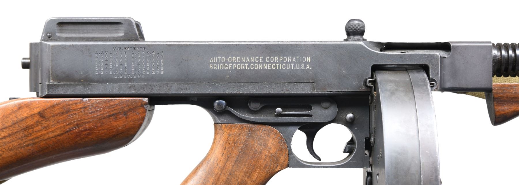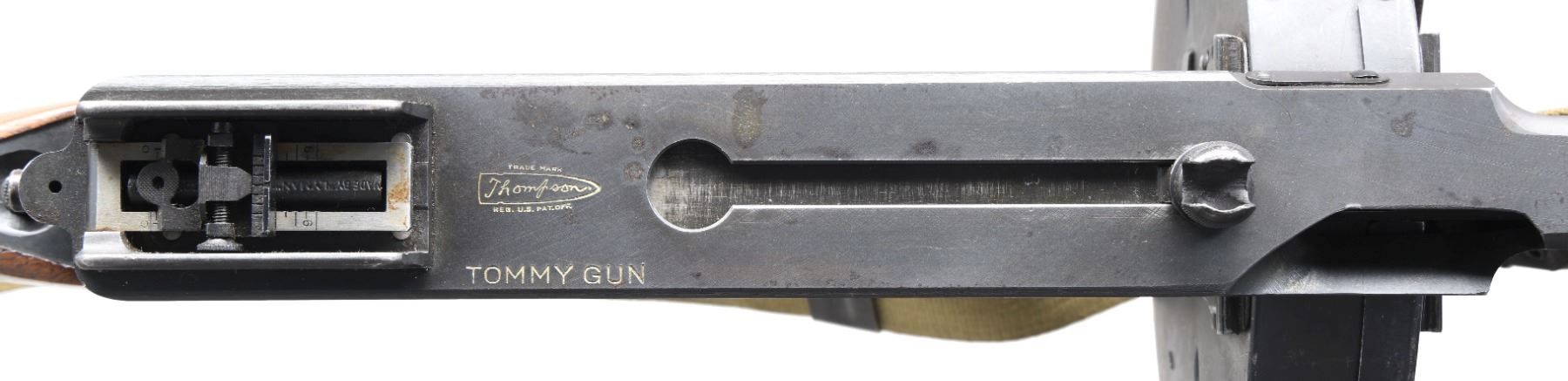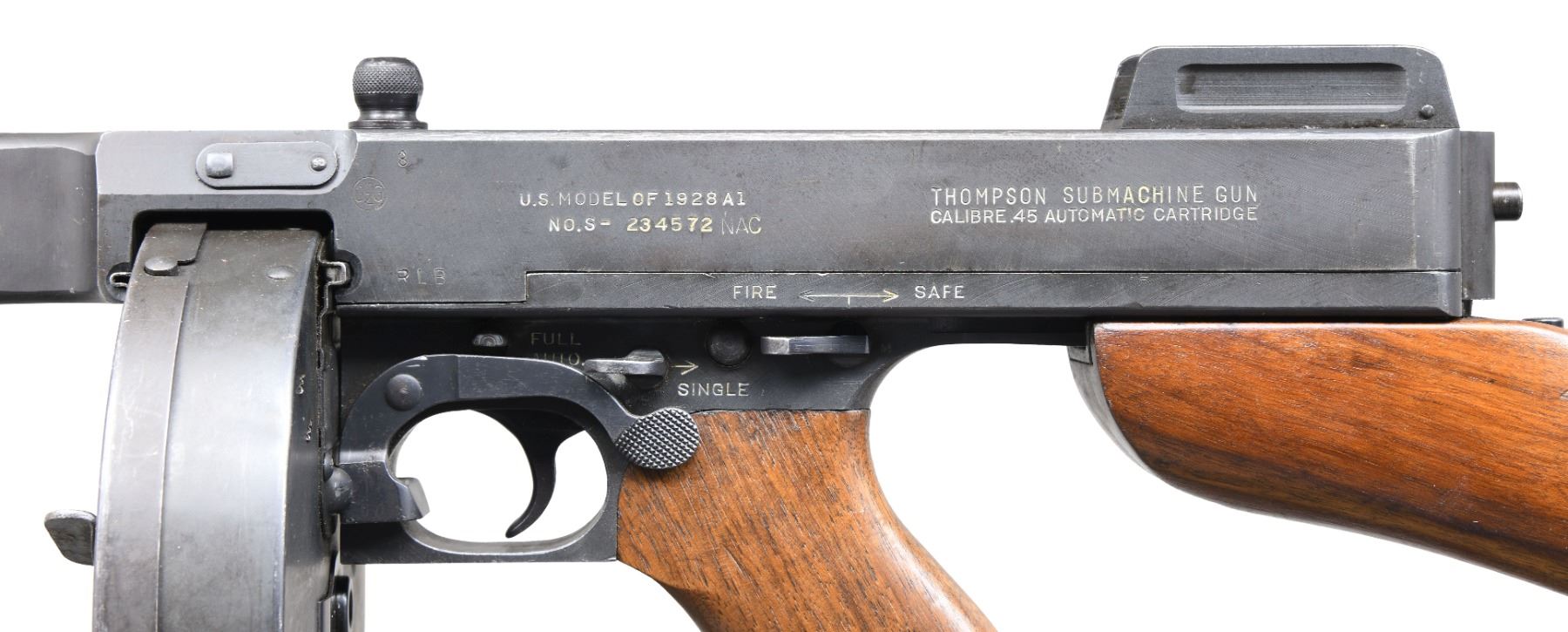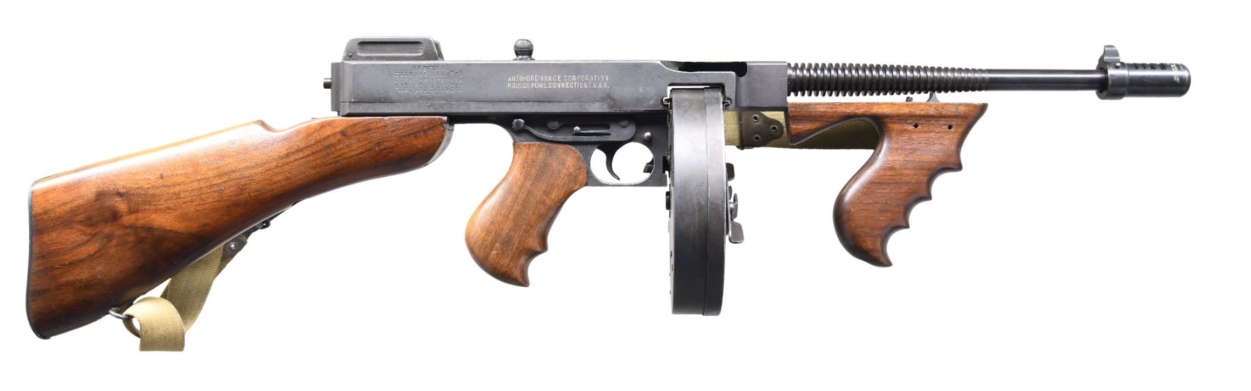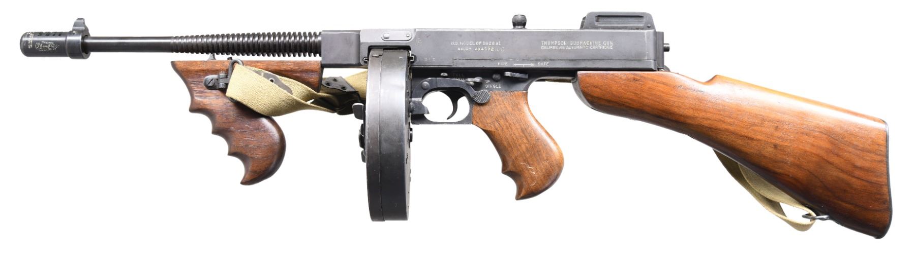 1928A1 THOMPSON SUBMACHINE GUN, C&R. Cal. 45 ACP. S# S-234572. Bbl. 10 1/2". Classic Thompson SMG US Model 1928 A1 mfg. by Auto-Ordnance in Bridgeport, CT. 28 Rib finned bbl. Terminated w/ Cutts compensator marked w/ Thompson bullet logo, Cutts logo, "Auto-Ordnance Corporation" & patent dates. Vertical pistol grip wood fore arm. Front blade sight integral w/ compensator & rear is adj. Lyman graduated sight. Hardwood, rear stock w/ trapdoor buttplate. Sling swivels at 6-O'clock at rear & on left side on front, currently sporting tan canvas sling. Slotted & knurled, top mounted cocking knob. Blued finish on exposed metal surfaces. Left side receiver markings are as follows: Inspectors marks "GEG" & "RLL" indicating that it was inspected by George E. Goll, Auto-Ordnance's chief inspector & Army Inspector of Ordnance Ray L. Bowlin. "U.S. Model of 1928 A1", "Thompson Submachine Gun", "Calibre 45 Automatic Cartridge" as well as the serial number, w/ the "NAC" suffix, not included in the database SN. Right side markings include patent block on rear of receiver & "Auto-Ordnance Corporation", "Bridgeport Connecticut, U.S.A.". Trigger frame serial number "S-234572" also w/ the "NAC" suffex, matching receiver. MAGS: 3 Seymour 30 rd. & 1 United Specialties Company marked 50 rd drum. CONDITION: finish on exposed metal surfaces complete & consistent, w/ some thinning on high spots & in areas of mechanical intervention w/ a few light drag lines usually associated w/ rack storage. All original markings are easy to read w/ the exception of some uneven inspectors marks as normal, & attractively filled in white for a nice contrast. Wood furniture is matching in finish and has a few period typical depressions. Bright bore w/ visible rifling. Fire control mechanism appears to function correctly when cycled by hand. FULLY TRANSFERABLE NATIONAL FIREARMS ACT SMG REQUIRING BATF TRANSFER BEFORE TAKING POSSESSION. PROVENANCE: From the Lifelong Collection of Brian Linde. (03-1832/JZ). CURIO, CLASS III. $18,000-27,000.