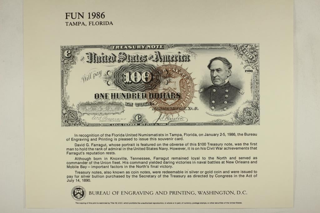 WITH ENGRAVING OF OBVERSE OF AN 1890 $100 TREASURY NOTE BY THE BUREAU OF ENGRAVING AND PRINTING