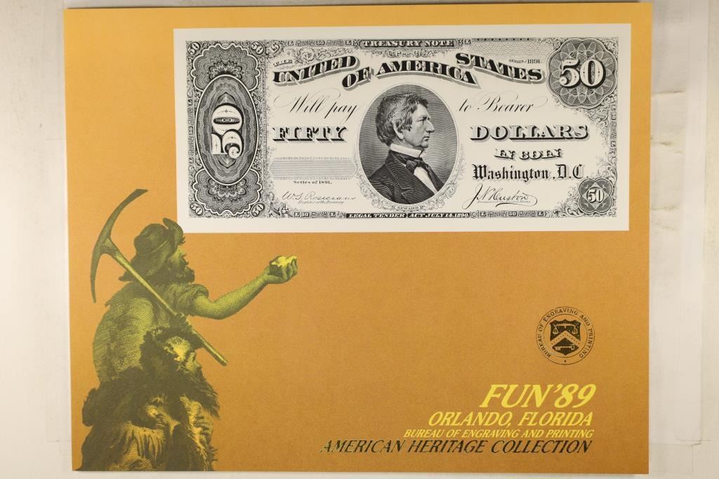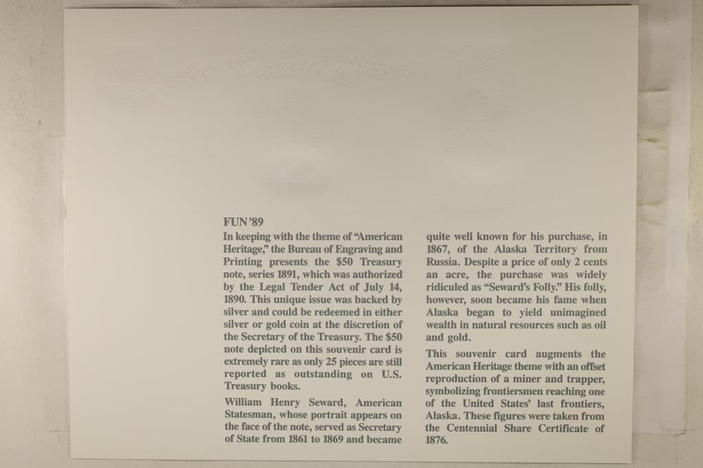 COLLECTION SOUVENIR CARD FEATURING THE OBV. OF A 1891 US $50 TREASURY NOTE, PRINTED BY THE BUREAU OF ENGRAVING AND PRINTING