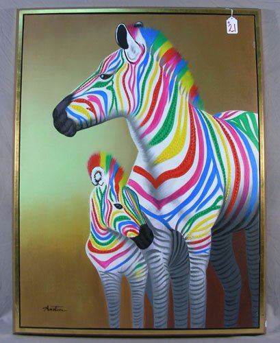 A large original oil on canvas of mother zebra with baby. Multi colored stripes. Paint in high relief. Signed. Gilt shadow box frame. Overall 52" x 39 1/2".