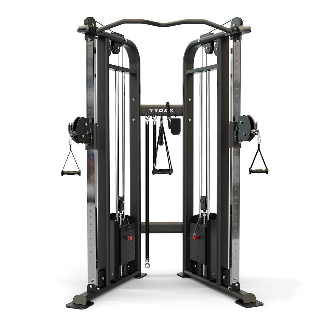 THE TYDAX GLADIATOR FUNCTIONAL TRAINER DELIVERS A BOLD CHROME LOOK WITH A SLEEK BLACK POWDER COAT FINISH TO ANY GYM SET-UP. THIS TRAINER DELIVERS ALL THE BENEFITS OF A CABLE MACHINE WHILE ALSO INCORPORATING A MULTI-GRIP PULL-UP BAR TO TAKE YOUR RESISTANCE TRAINING WORKOUT TO THE NEXT LEVEL. LOADED WITH 2 INTUITIVELY COLOUR CODED, 160LB WEIGHT STACKS WHICH SEAMLESSLY ATTACH TO A VARIETY OF CABLE ATTACHMENTS, THE GLADIATOR GIVES ALL ATHLETES THE ABILITY TO TRAIN SPECIFIC MUSCLE GROUPS AT A WIDE RANGE OF LOADINGS, DOMAINS, INTENSITIES AND ANGLES. IT’S SMALL BUT STURDY BASE (55” W X 40” D X 82” H) MAKES IT THE MOST FUNCTIONAL PIECE OF EQUIPMENT FOR ANY HOME GYM OR SPACE CONSCIOUS SET-UPS. WITH COUNTLESS POSSIBILITIES, THE GLADIATOR FUNCTIONAL TRAINER CAN INCORPORATE AN UNMATCHED LEVEL OF VARIETY INTO ANY WORKOUT ROUTINE. SPECS: OVERALL DIMENSIONS: 55” W X 40” D X 82” H, 160LB WEIGHT STACKER, 31 DIFFERENT CABLE ATTACHMENT LOCATIONS FOR ULTIMATE VERSATILITY, VARIOUS GRIP ATTACHMENTS INCLUDED, MULTI-GRIP PULL-UP BAR, PLASTIC COATING TO INCREASE CABLE DURABILITY, 50 X 100 X 2.5MM HEAVY-GAUGE FLAT OVAL TUBING, HIGH QUALITY ELECTROSTATIC POWDER COAT FINISH. A STANDARD TWO-COAT POWDER COATING THAT’S HIGHLY RESISTANT TO CHIPS AND SCRATCHES, INCORPORATES AN INTUITIVELY COLOR CODED AND SPRING-LOADED PULL-PIN FOR FAST AND EASY WEIGHT ADJUSTMENTS, NON-ABSORBING PVC COMPOUND RETAINED GRIPS WITH SLEEK ALUMINUM COLLARS, HIGH DENSITY PVC FOOT GUARDS, CHROMED PLATE HOLDERS AND BAR SUPPORTS TO PROTECT THE POWDER COATED FRAME’S FINISH.