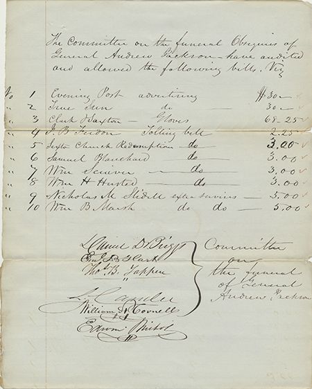 Unusual manuscript D.S 1p. 4to., [New York, n.d., but docketed Aug. 1845] being an expense report submitted by the "Committee on the funeral of General Andrew Jackson" for funeral services held in Jackson's honor in New York City on June 24, 1845. The document is headed "The Committee of the funeral Obsequies of General Andrew Jackson have audited and allowed the following bills." The expenses included $60 for advertisements in the "Evening Post" and the "True Sun" as well as $3 allotted to five men for tolling bells. The largest expense ($68) was for gloves for the mourners that were provided by the firm of Clark & Saxton at 175 Broadway. The distribution of gloves at funerals was a common practice in the late eighteenth and nineteenth century. light toning at extreme margins and folds, fold splits requiring repair, else very good.