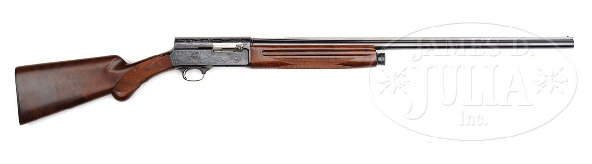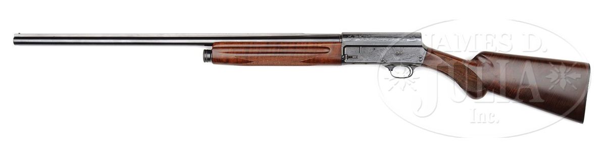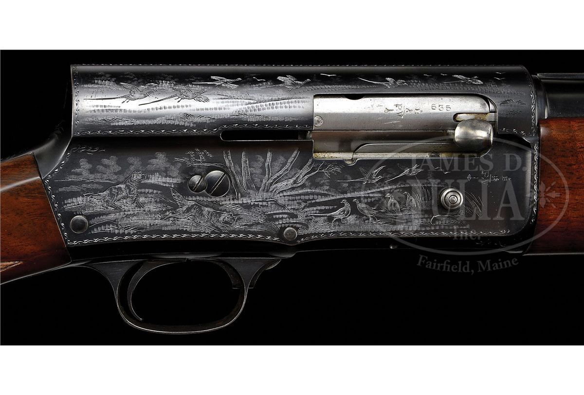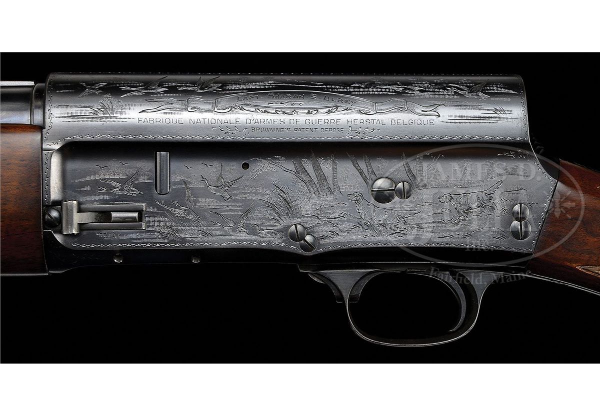SN 126635. Cal. 16 ga. 2-5/8" Chamber. Produced at the end of the WWII, when all FN sporting production was allotted to servicemen, this interesting gun, with no markings on 27" bbl with raised, matted rib, is engraved on left top of receiver "Capt. Sharon. S. Ulrey" in scrolled riband over FN nomenclature. Sides of action are engraved with game birds and dogs in open woodlands, with a pair of setters pointing group of ducks flushing from pond on left; and more setters pointing group of pheasants on right. Another flock of pheasants are flying along top right of action. This interesting engraving is by Felix Funken whose signature appears under magazine cut-off on left side of action. Nicely stump figured red-toned American walnut checkered, round knob buttstock measures 14-1/4" over composition FN buttplate. Standard forend with finger grooves has matching checkering and wood. Drop at heel: 2-7/16", drop at comb: 1-1/2". Weight: 7 lbs. 14 oz. LOP: 14-1/2". CONDITION: Excellent, as refurbished. Metal parts retain nearly all of a good quality re-blue. Stocks are new. Mechanically crisp. 4-49054 MGM193