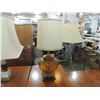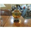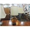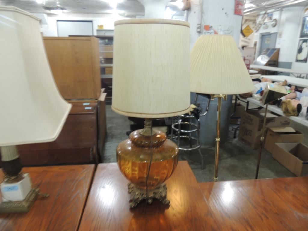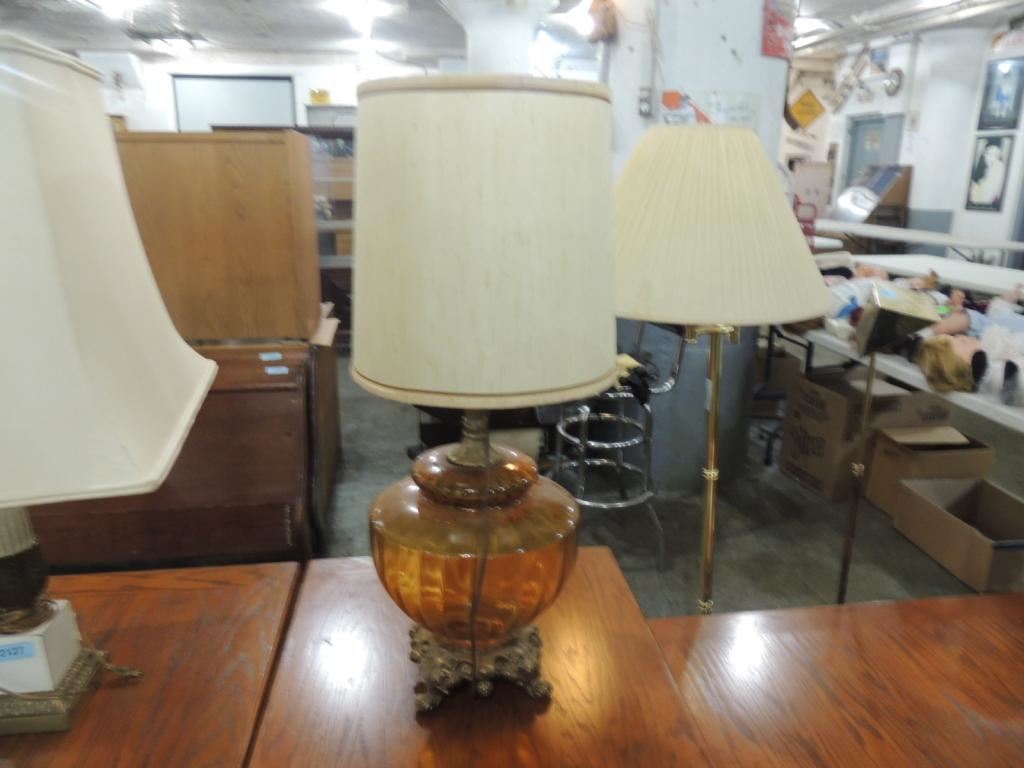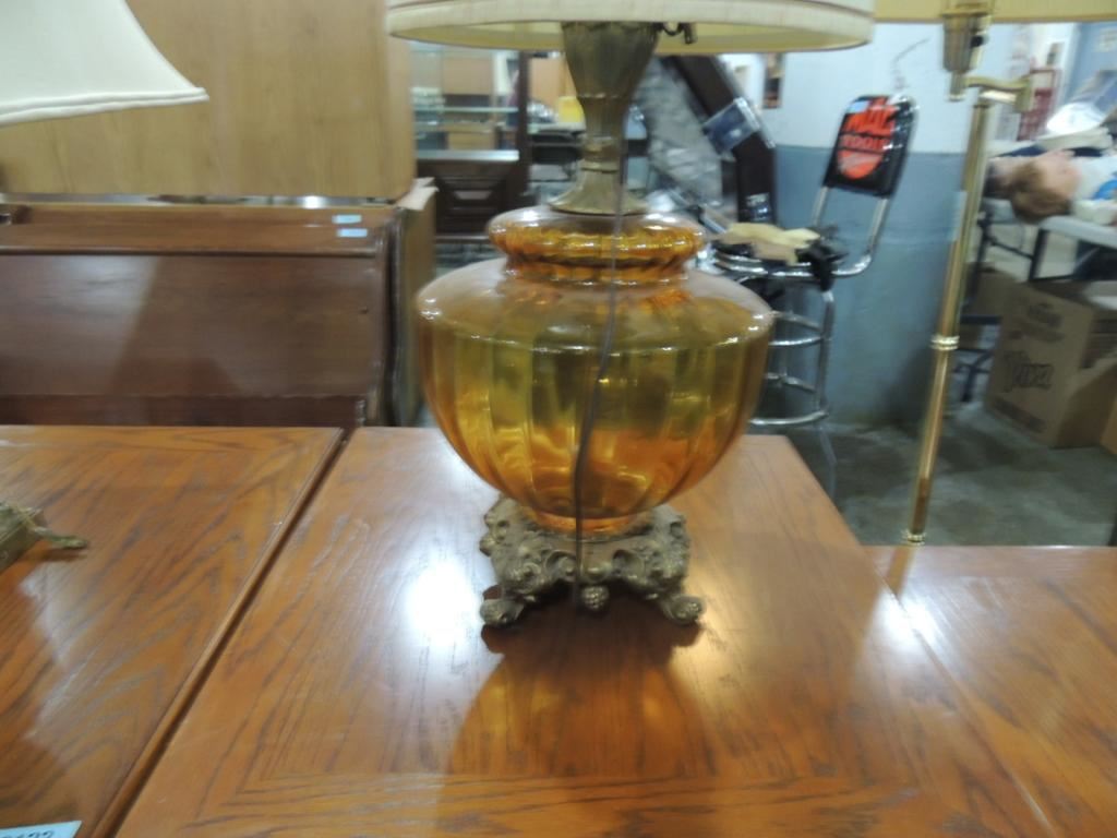 TABLE LAMP, LARGE GLASS TABLE LAMP, AMBER COLORED METAL FOOTED BASE TABLE LAMP AS SHOWN SEE PHOTO FOR MORE DETAILS.