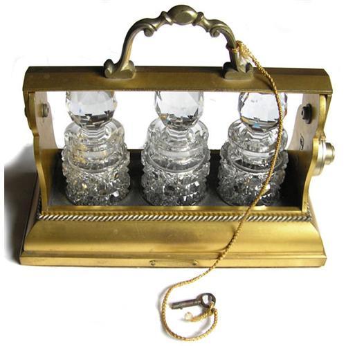 This is a antique tantalus from the 19th century by the English firm, Furber & Sons of Cheltenham in Gloucester England. Original cut glass decanters and stoppers. Each cut glass decanter has some losses. Carriage measures 9" by 7.5" by 4.25". Key currently does not work but the top does move up and down as shown in our photos here. Marked " Betjemann's Patent London 6588 ". Thanks for visiting. Please let us know if you have any questions or comments.