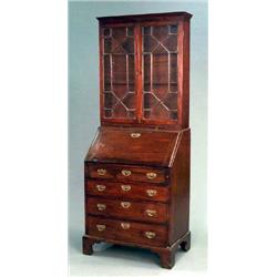 A small George II mahogany bureau-bookcase, the two moulded adjustable shelves enclosed by a pair of thirteen-pane astragal moulded doors above candle slides, the bureau enclosing a fitted interior above four long cockbeaded drawers with pierced brass loop handles and escutcheons, on bracket feet, 30in wide, 77.5in high, mid-18th century (old repairs and alterations)