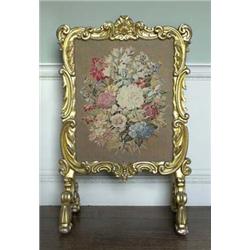 FURNITURE - A George IV giltwood rococo revival firescreen, of boldly scrolling leaf and shell carved design, enclosing a gros point needlework panel embroidered with summer flowers on a natural ground, 28.5in wide, 45in high, c.1825 (see illustration)