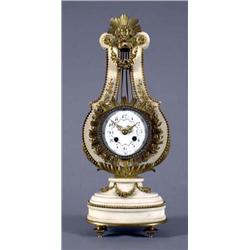 FURNITURE - A Louis XVI revival ormolu mounted and 'jewelled' white marble mantel clock, the white enamelled 3.75in circular dial with Arabic chapter ring and ribbon tied floral festoons, eight day movement, striking on a bell, the bezel set with paste diamonds, the strung frame with laurel mounts, rose swags and beading beneath a sunburst, toupie feet, 19.5in high, c.1860 (see illustration)
