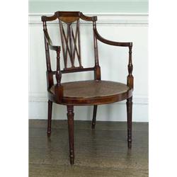 FURNITURE - An Edwardian mahogany Sheraton revival elbow chair, the raised rectangular back with X-railed splat and outlined with boxwood stringing, downswept arms and circular caned seat, on slender turned tapering legs, early 20th century (see illustration)