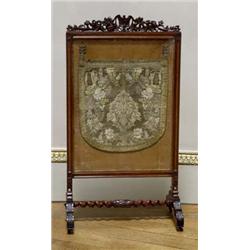 FURNITURE - A William IV walnut cheval screen, in Romantic style, the slender panelled rectangular frame with carved rosettes to angles, the cresting pierced with flowers and leaves, enclosing a shield shaped mantle finely embroidered with flowers in silk and metal threads, silver 'bullion' border and tassels, all beneath a rising silk lined panel, on recurving scroll supports joined by a leaf carved spirally turned stretcher, brass castors, 52in high, 25.5in wide, c.1835 (see illustration)