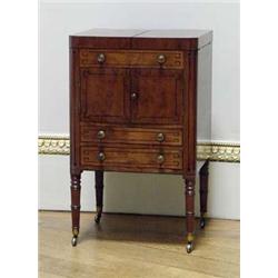 FURNITURE - A good Regency mahogany washstand, of rounded rectangular form, the folding top enclosing a sliding mirror and provision for wash basin, etc, above a blind drawer, two-door cupboard and pair of shallow drawers, gilt brass drum handles and inlaid with ebony key pattern and line-and-spot stringing, the tapering ringed legs with brass socket castors, 22in wide, 19in deep, 36in high, c.1815 (see illustration)