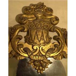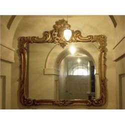 FURNITURE - A large William IV giltwood wall mirror, the broad undulating frame boldly carved with shellwork and flowers, the cresting with central armorial and motto 'Pro Patria Semper', 64in x 62in, c.1835 (see illustration)