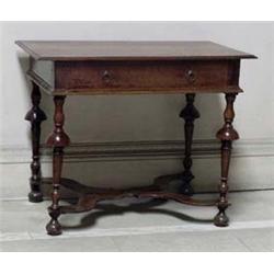 FURNITURE - A William III oak side table, the rectangular top with ovolo lip above a moulded frieze with drawer and loose ring handles, on mushroom turned baluster legs joined by broad curving cross-stretchers, bun feet, 36in wide, late 17th century (see illustration)