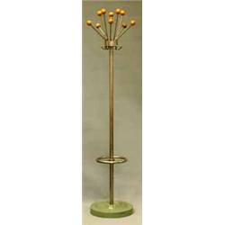 TAMBURMAJOR, KROMAD STÄLLNING MED PARAPLYSTÄLL OCH KROKAR, RUND GRÖNMÅLAD FOT, HATTHÄNGARE I KROM MED RUNDA BJÖRKKNOPPAR, FUNKIS 1930-TAL, H205