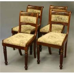 4 STOLAR, MAHOGNY, 4 RUNDA KÄLADE BEN, BAKÅTSVÄNGD RYGG MED INLÄGGNINAR I MÄSSING, SENEMPIR C. 1840