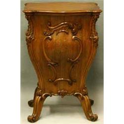 PIEDESTAL, VALNÖT, SVÄNGD BUKIG FORM, 4 SVÄNGDA SKURNA BEN, SKURNA SIDOR, MITTDEKOR MED ROCAILLER, SVÄNGD SKUREN SKIVA MED KÄLAD DEKOR, ROKOKOSTIL, 1800-TAL, H90, B61, D53