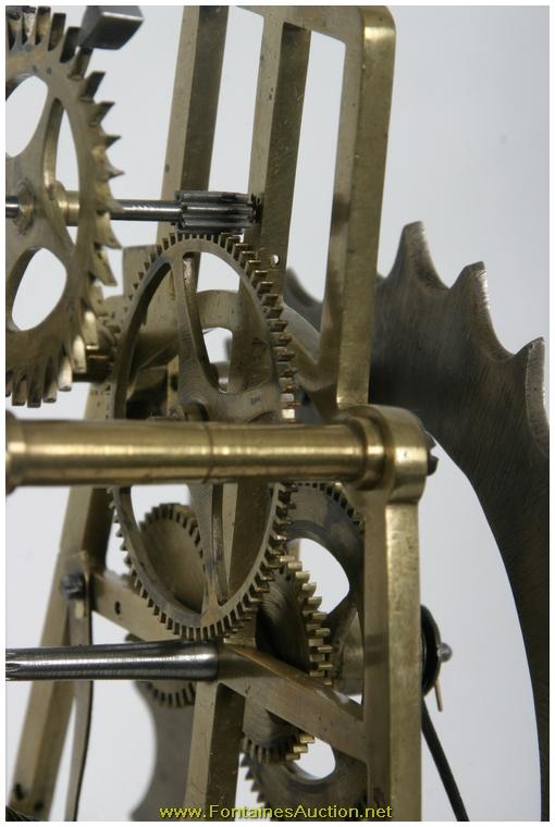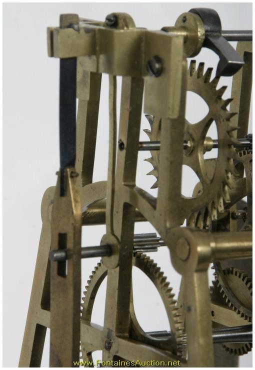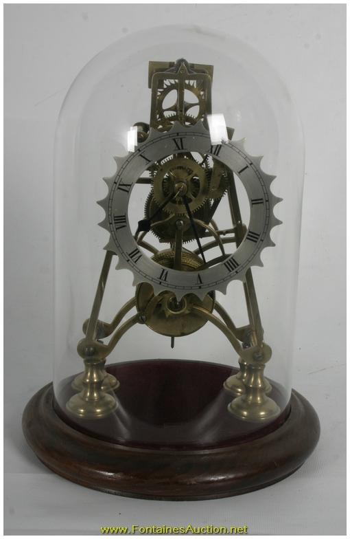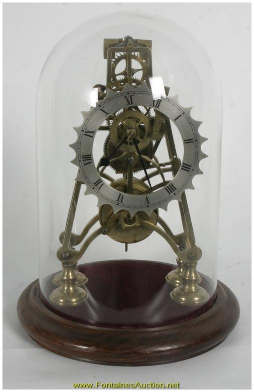 Time Only Fusee Skeleton Clock in Dome. Black poker hands, fancy silvered chapter ring and 4" dial with black roman numerals and minute markers, brass skeletonized fusee movement, time only supported on 4 bell form feet under a glass dome. 8.5"W x 12"H. Estimated Value$1,000 - 1,500.