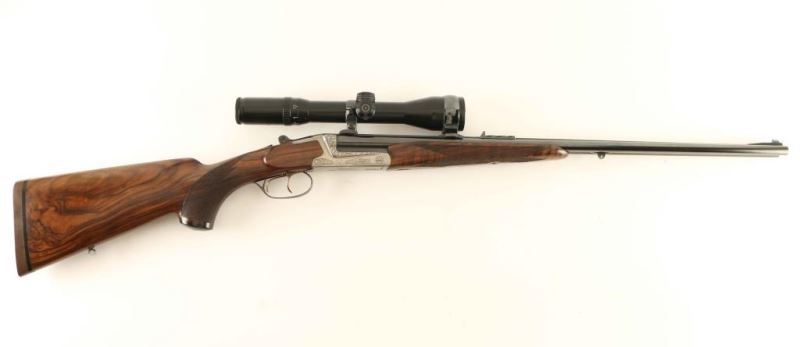 Superlative quality side-by-side double boxlock rifle chambered in 9.3x74Rmm, manufactured in West Germany by Friedrich Wilhelm Heym circa 1983. Features blued 25" Krupp-Special Laufstahl barrels with raised rib, selective ejectors, ramped blade front sight with brass bead, triple leaf express rear sight, Schmidt & Bender 1.5-6x 40mm scope with claw mount, double triggers, gold cocked indicators, sliding tang safety, knurled top lever, coin finished receiver with scroll engraving, swivel studs, finely checkered figured wood semi-beavertail forend and pistol grip shoulder stock with right handed cheek rest & Old English recoil pad. Includes a Treadlok aluminum case with brown carrying bag, a fitted foam interior, and 18 rounds of RWS 285 grain SP RN ammo. Rifle exhibits approximately 99% of it's original finish showing little to no visible wear. Action is smooth, bores are pristine, optics are sharp and the wood stocks are fine. Condition is NRA Perfect in case. ***Modern Firearm***