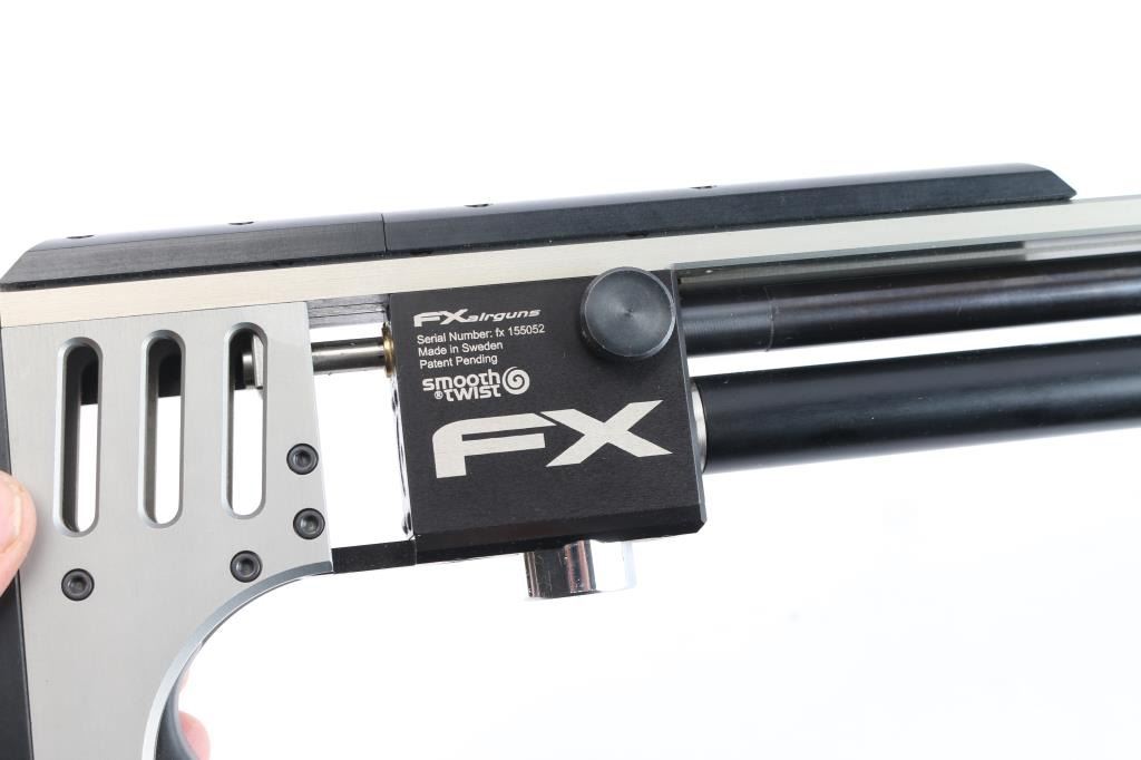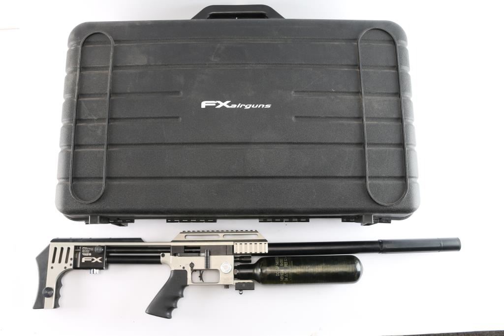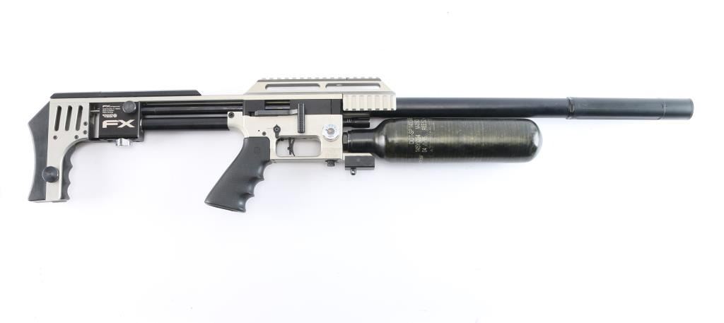 Quality Swedish manufactured FX Impact X Silver Features: Fixed stackable moderator system, FX smooth twist X barrel with DonnyFL KOI Moderator, forward positioned sidelever cocking action, Interchangeable caliber system (additional caliber barrels available) externally adjustable pressure regulator, hammerspring tension power adjuster, valve adjuster (valve flow tuning). Two pressure gauges: one for airtube pressure, one for regulator pressure, removable 480cc carbon fiber air cylinder, max fill pressure is 250 bar (3600 psi), removable rotary magazine, fully adjustable match trigger (factory set at 1 lb 11 oz), picatinney/Weaver scope rail, picatinney accessory rails on either side of the forearm and one rail beneath, Hogue rubber pistol grip, adjustable recoil pad (height), AR15 style safety switch (manual), male quick-disconnect foster fitting for fast refills. excellent, like new condition. Comes in form fitted factory hard case with manual, one magazine, spare gaskets, pins and barrel shroud.