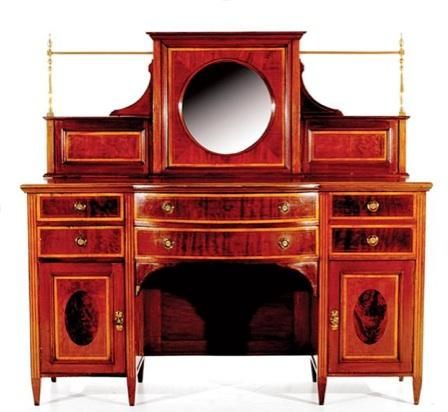 FY74 Edwardian inlaid mahogany bowfront sideboard early 20th century _superstructure of circular mirror in square frame flanked by brass galleries and panels, on shaped case with configuration of door and drawers, on short tapered legs. _H68~ W72~ D24~