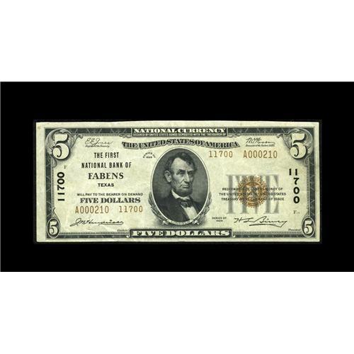 <B>Fabens, TX</B></I> - $5 1929 Ty. 2 <B>The First NB</B></I> Ch. # 11700<BR>Newly discovered, with this being the first $5 to surface on this El Paso County bank that was chartered in May 1920, but elected to issue only $5, $10, and $20 Type Two notes. In fact this makes only the fifth note for this elusive bank to turn up and the first new serial number in years. This bright <B>Extremely Fine</B></I> note has healthy edges and nice color.
