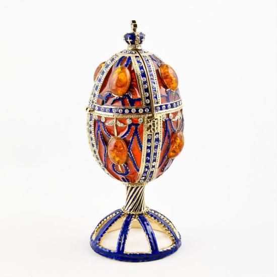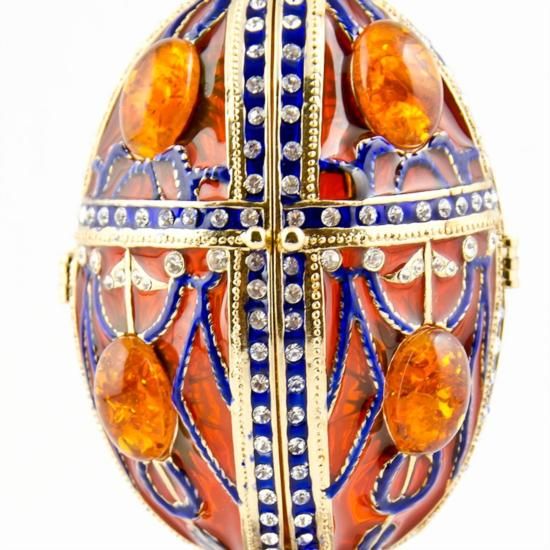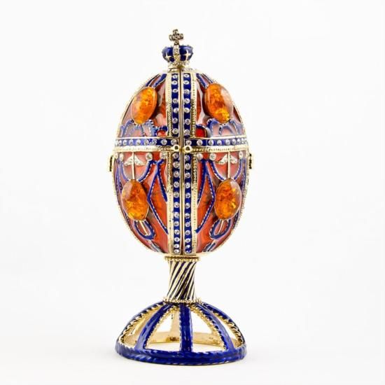 Faberge Amber Egg, Beautiful amber colored egg with blue enamel rays. The egg is ornamented with 8 amber gems located on each plate. Tiny crystals surround the blue enamel that divides the egg into 8 similar sections. A miniature blue and golden crown is placed on the top of the egg surrounded by tiny crystals. Material: Pewter, Austrian Crystals, Enamel. Dimensions: 5in (H) X 2in (Egg Diameter) The famed Faberge eggs are jeweled eggs, often with the most ornate, minuscule designs on them. The House of Faberge made the original pieces from 1885 to 1917. At that time, they became popular gifts given during the Easter season. Larger versions were made for the Russian royal family, including Alexander III and Nicolas II. Of these, 42 of the 50 originals exist today. Most Faberge eggs, though, were much smaller and hung from a chain around the neck. These eggs have precious metals on them or gemstone decorations, often with intricate detailing. These are a symbol of luxury and thought of as individual masterpieces.