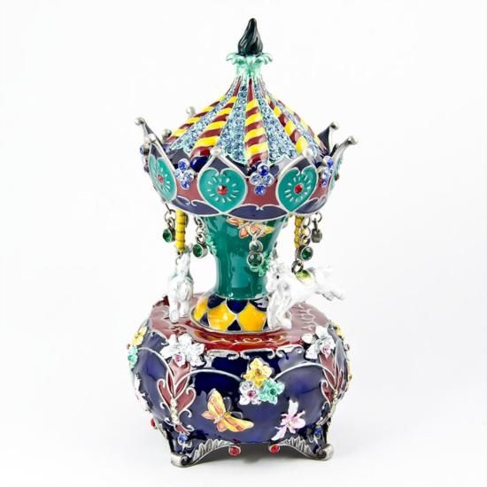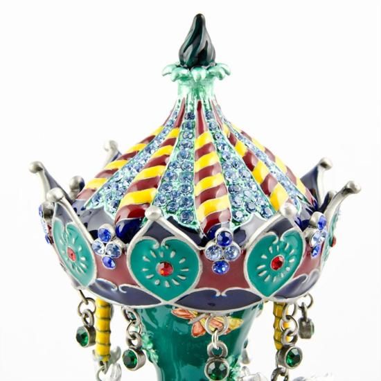 Faberge Carousel. Using an guiloche enamel technique, this figurine includes blue, green, yellow, maroon, and white colors. The bottom of the carousel is ornamented with flowers, while the top of it is ornamented mainly with blue crystals. The horses are white and hanging from a little chain with a crystal on it. True beauty and sparkling colors make this Carousel Figurine an esceptional piece. Material: Pewter, Crystals, Enamel. Dimensions: 5.5in (H) X 2.5in (D) The famed Faberge eggs are jeweled eggs, often with the most ornate, minuscule designs on them. The House of Faberge made the original pieces from 1885 to 1917. At that time, they became popular gifts given during the Easter season. Larger versions were made for the Russian royal family, including Alexander III and Nicolas II. Of these, 42 of the 50 originals exist today. Most Faberge eggs, though, were much smaller and hung from a chain around the neck. These eggs have precious metals on them or gemstone decorations, often with intricate detailing. These are a symbol of luxury and thought of as individual masterpieces.
