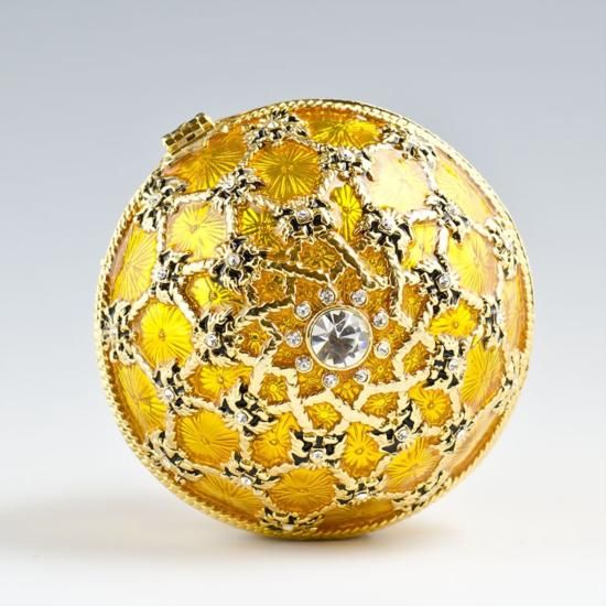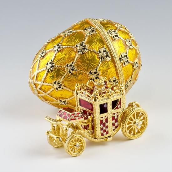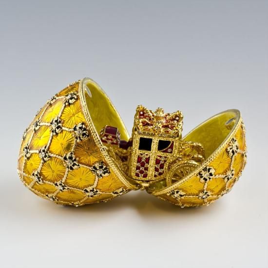 Faberge Coronation Egg, Dimensions: 3.5in (H) X 2.5in (W), Weight: 1 lb 2 oz, Material: Pewter, Crystals, Enamel. The Coronation Egg from 1897 is the most famous and celebrated of Carl Faberges creations. It was made to honor the Russian Tsar Nicholas II and his wife, Alexandra Fyodorovna coronation ceremony. The surprise concealed in the Coronation Egg is a removable miniature replica of the Imperial coach used by Alexandra Fyodorovna on her entry into Moscow to her coronation at the Uspensky Cathedral. The famed Faberge eggs are jeweled eggs, often with the most ornate, minuscule designs on them. The House of Faberge made the original pieces from 1885 to 1917. At that time, they became popular gifts given during the Easter season. Larger versions were made for the Russian royal family, including Alexander III and Nicolas II. Of these, 42 of the 50 originals exist today. Most Faberge eggs, though, were much smaller and hung from a chain around the neck. These eggs have precious metals on them or gemstone decorations, often with intricate detailing. These are a symbol of luxury and thought of as individual masterpieces.