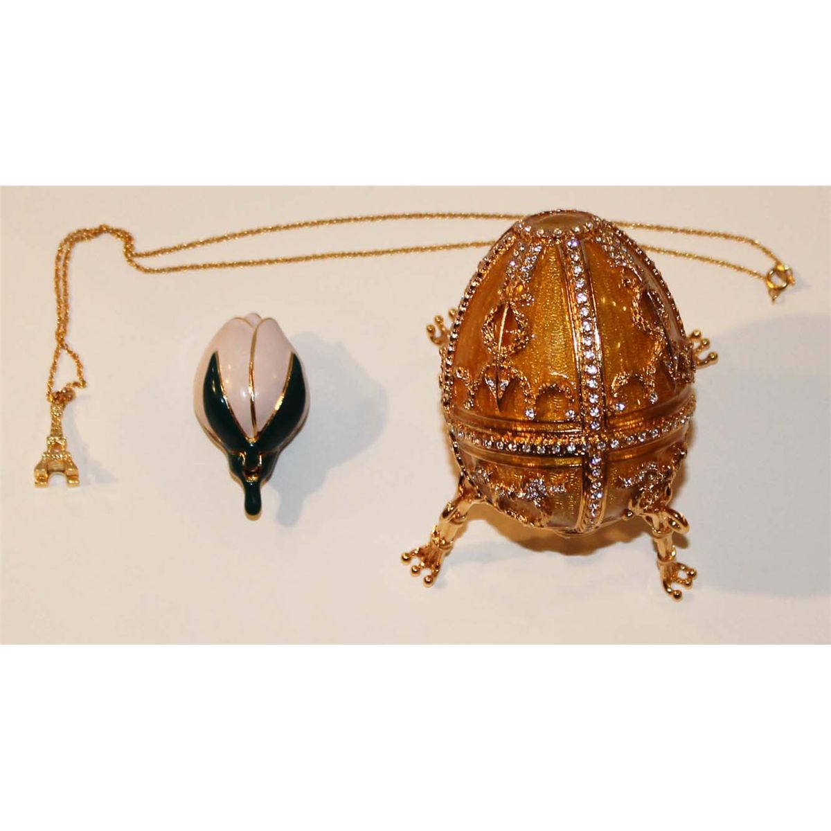 Absolutely beautiful Faberge Rosebud egg, complete with stand and blue velvet Faberge box. Yellow-gold and crystal egg, in an intricate guilloche pattern, opens to reveal a cream velvet interior which holds a green and pale pink enamel tulip flower which, in turn, opens to display a gilt Eiffel Tower pendant dangling from the Faberge necklace. A playful twist on the custom of nesting boxes, with the smallest box ultimately holding the most exquisite gift. Egg measures 3'' high and pendant .75''. Near fine condition with Faberge COA.