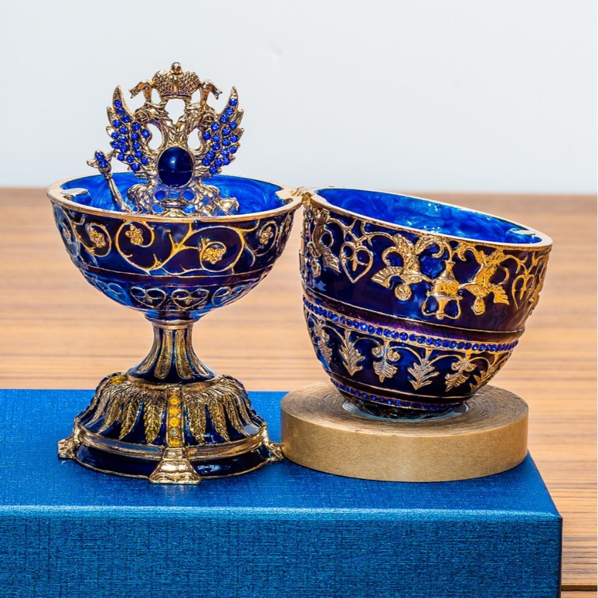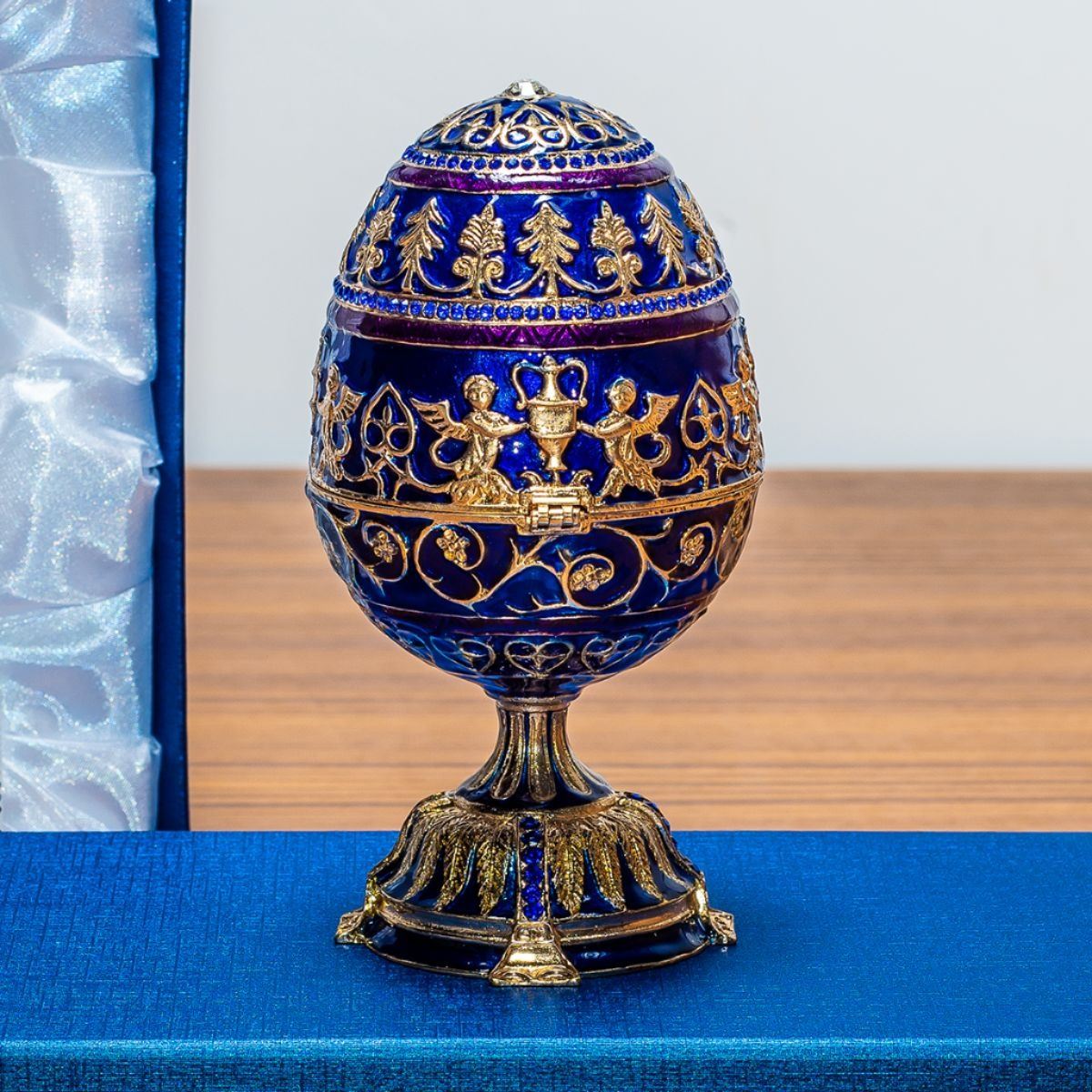 This sparkling egg is adorned with clear crystals and high-polished enamel with golden trim. It opens on a hinge and has a magnetic closure to keep the box securely shut. The piece also comes in a beautiful gift box. The Tsarevich Egg is a Faberge egg, one in a series of fifty-two jeweled eggs made under the supervision of Peter Carl Faberge. It was created in 1912 for Empress Alexandra Fyodorovna as a tribute by Faberge to her son the Tsarevich Alexis (Alexei). The egg currently resides in the Virginia Museum of Fine Arts.