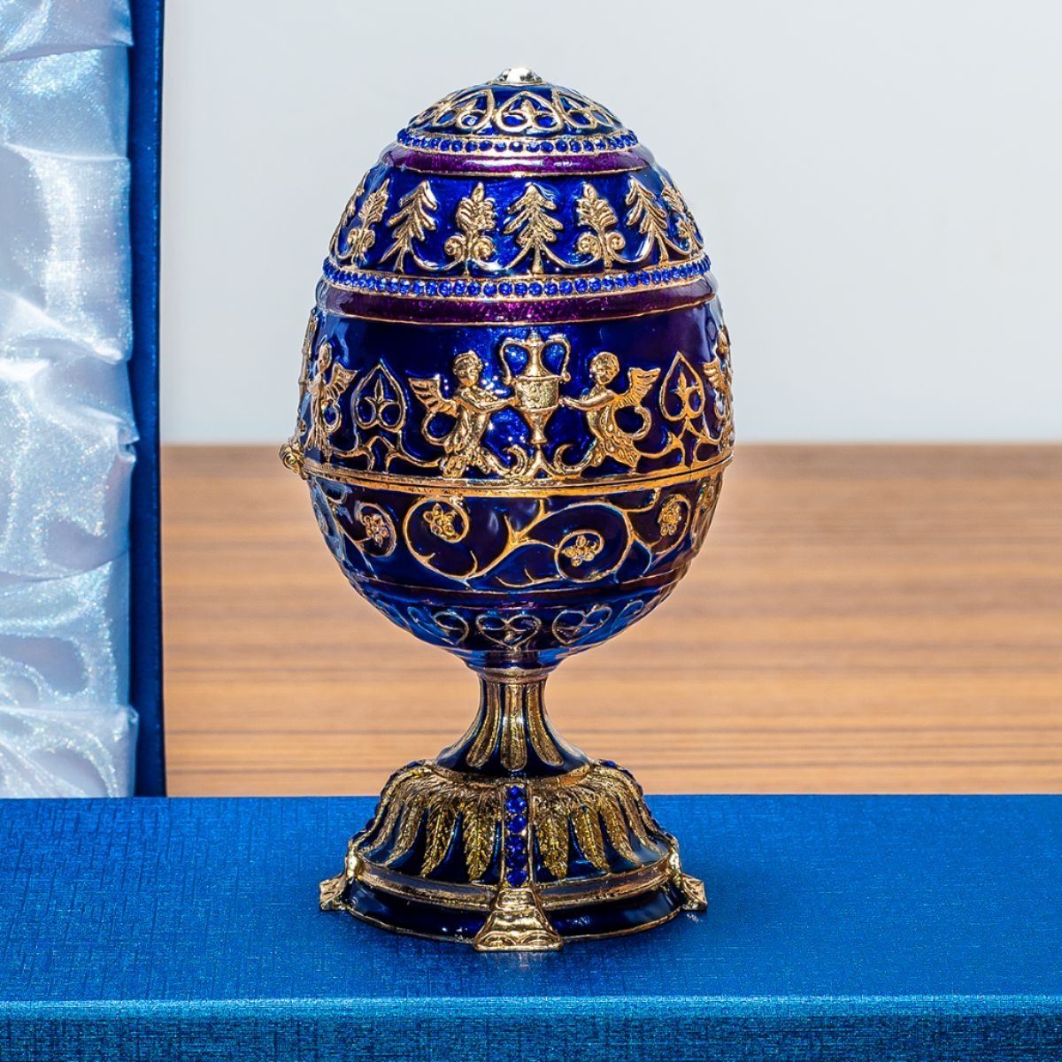 This sparkling egg is adorned with clear crystals and high-polished enamel with golden trim. It opens on a hinge and has a magnetic closure to keep the box securely shut. The piece also comes in a beautiful gift box. The Tsarevich Egg is a Faberge egg, one in a series of fifty-two jeweled eggs made under the supervision of Peter Carl Faberge. It was created in 1912 for Empress Alexandra Fyodorovna as a tribute by Faberge to her son the Tsarevich Alexis (Alexei). The egg currently resides in the Virginia Museum of Fine Arts.