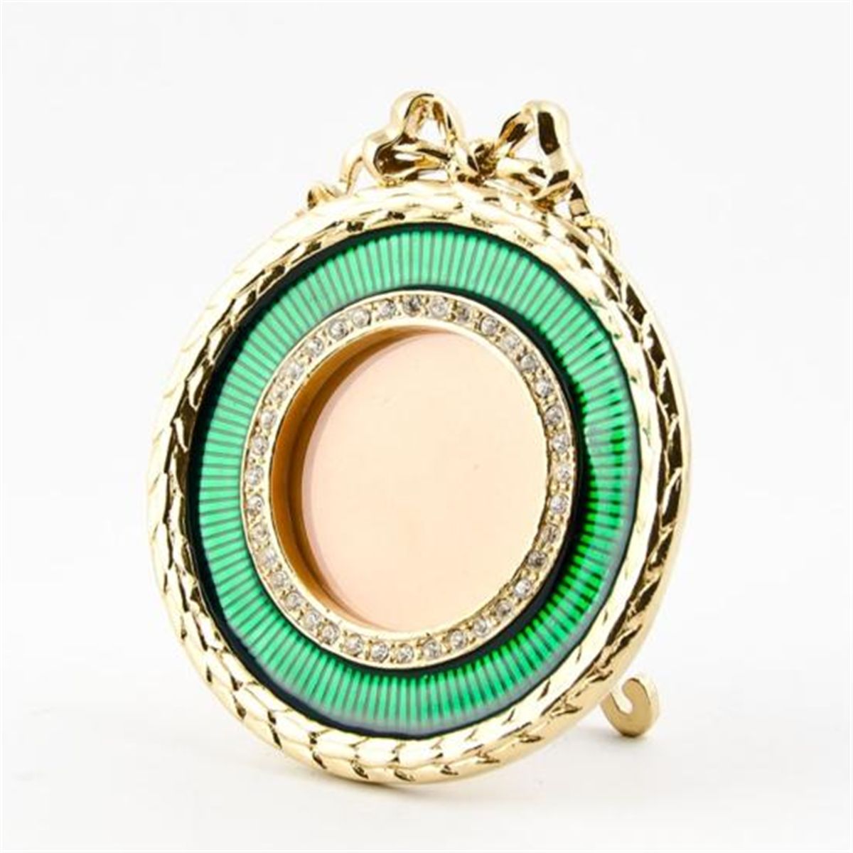Faberge Enameled Photo Frame, A small circular frame of shimmering green enamel ornamented with a delicate golden bow-knot and golden chased laurel border. A crystal mounted border surrounds the photo slot. Absolute miniature beauty is represented by this miniature Faberge picture frame. Dimensions: 3in (H) x 2.5in (D), Material: Pewter, Enamel, Crystals.