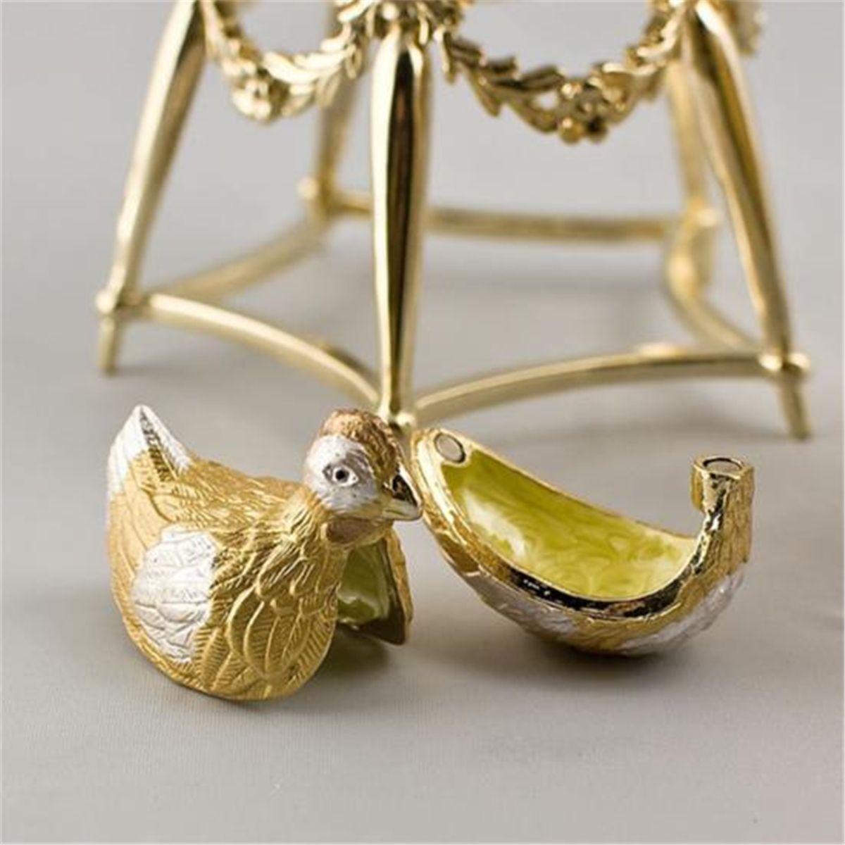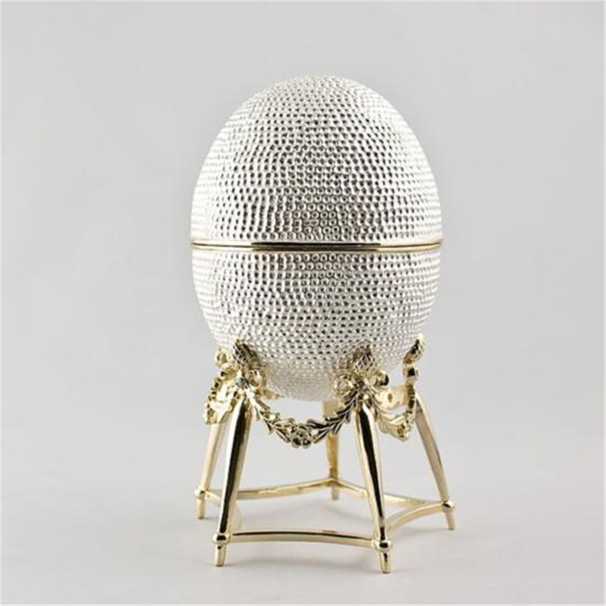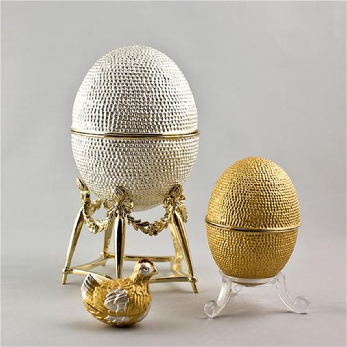 Faberge Hen Egg. Material: Pewter, Enamel, Weight: apprx 2lbs. The famed Faberge eggs are jeweled eggs, often with the most ornate, minuscule designs on them. The House of Faberge made the original pieces from 1885 to 1917. At that time, they became popular gifts given during the Easter season. Larger versions were made for the Russian royal family, including Alexander III and Nicolas II. Of these, 42 of the 50 originals exist today. Most Faberge eggs, though, were much smaller and hung from a chain around the neck. These eggs have precious metals on them or gemstone decorations, often with intricate detailing. These are a symbol of luxury and thought of as individual masterpieces.