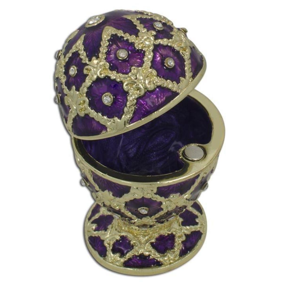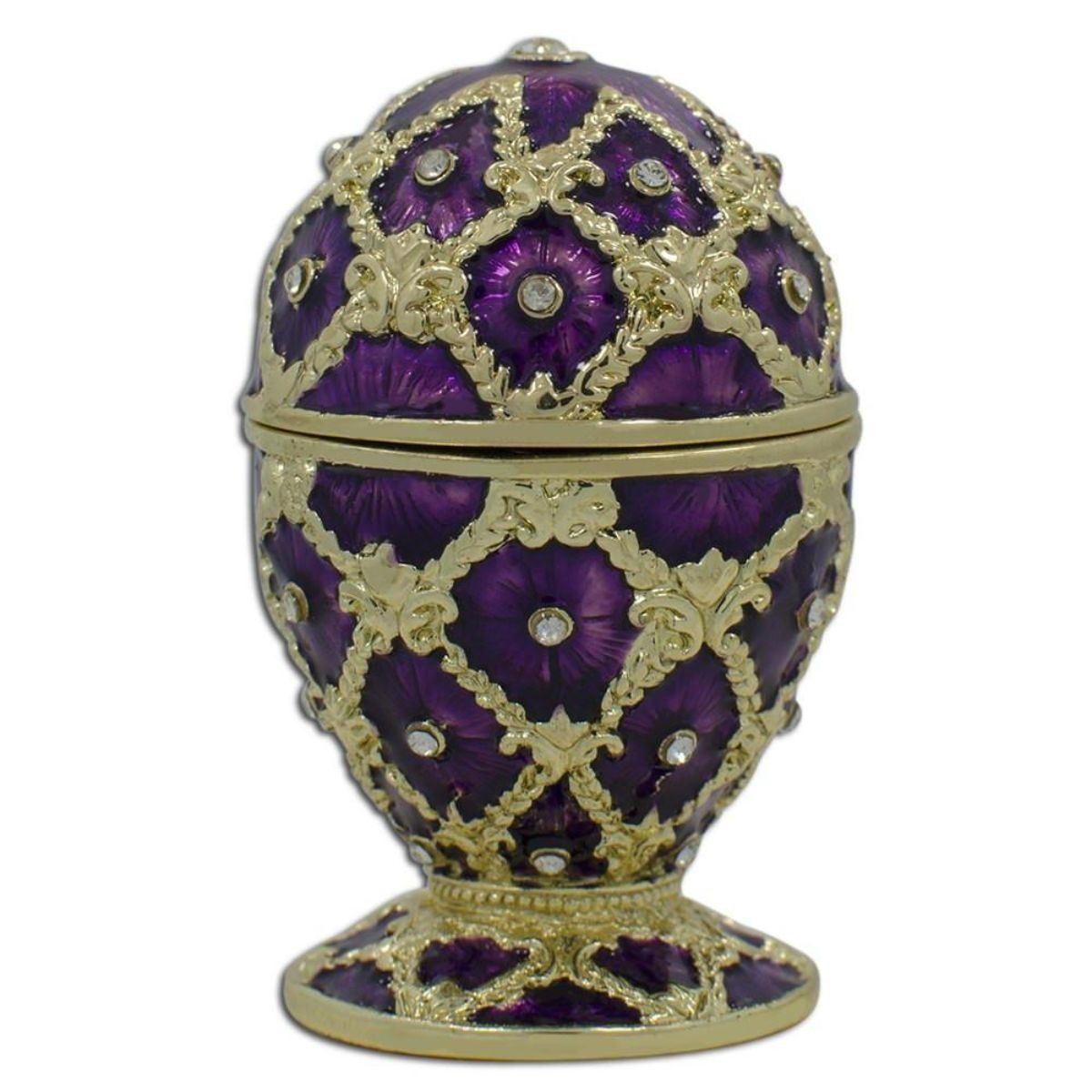 2.5" Purple Trellis Royal Inspired Russian Easter Egg This sparkling egg is adorned with clear crystals and high-polished enamel with golden trim. It opens on a hinge and has a magnetic closure to keep the box securely shut. The piece also comes in a beautiful gift box. 2.5 Inches Tall Pewter, Crystals, Enamel Hand Painted Padded Satin Lined Gift Box Imported -- Faberge Eggs have a remarkable story and while the original Faberge eggs are virtually priceless, extraordinary re-creations of Carl Faberge’s works are not only fabulous to look at but wonderful to own and collect. You ask the question, “how much would an original Carl Faberge egg cost in today’s marketâ€. Here’s a story that will give you that answer: Los Angeles Times: “A Faberge egg found at a flea market by a scrap-metal dealer who initially didn't realize the value of what he had discovered will be on public view for the first time in more than a century, according to a British art and antiques dealer. The egg, thought to have been made in the late 19th century for Russian royalty, was purchased years ago at a U.S. flea market for just $14,000, said the antiques dealer, Wartski. The buyer was interested in the item for its gold content but later suspected the piece might be even more valuable. The egg was later sold to a private collector. The identities of the buyer and seller haven't been revealed. Wartski didn't disclose how much was paid for the egg, but some estimates put its value as high as $33 million. It will be on display at Wartski in London from April 14 to 17.†The first Faberge egg was crafted for Tsar Alexander III, who had decided to give his wife, the Empress Maria Fedorovna, an Easter egg in 1885, possibly to celebrate the 20th anniversary of their betrothal. Although there is no official record of the Tsar's inspiration for it, many believe that he was moved by an egg owned by the Empress’s aunt, Princess Vilhelmine Marie of Denmark, which had captivated Maria’s imagination in her childhood and of which the Tsar was well aware. Known as the Hen Egg, the very first Faberge egg is crafted from a foundation of gold. Its opaque white enameled "shell" opens to reveal a matte yellow-gold yolk. This in turn opens to reveal a multicolored gold hen that also opens. The hen contained a minute diamond replica of the imperial crown from which a small ruby pendant was suspended, but these last two elements have been lost.[2] Maria was so delighted by the gift that Alexander appointed Faberge a "goldsmith by special appointment to the Imperial Crown" and commissioned another egg the next year. After that, Peter Carl Faberge was apparently given complete freedom for the design of future imperial Easter eggs, and their designs became more elaborate. According to Faberge family lore, not even the Tsar knew what form they would take—the only requirements were that each contain a surprise, and that each be unique. Once Faberge had approved an initial design, the work was carried out by a team of craftsmen, among them Michael Perkhin, Henrik Wigstrom and Erik August Kollin.[citation needed] After Alexander III's death on 1 November 1894, his son, Nicholas II, presented a Faberge egg to both his wife, Alexandra Fedorovna, and his mother, the Dowager Empress Maria Fedorovna. Records have shown that of the 50 imperial Easter eggs, 20 were given to the former and 30 to the latter. Eggs were made each year except 1904 and 1905, during the Russo-Japanese War.[3] The imperial eggs enjoyed great fame, and Faberge was commissioned to make similar eggs for a few private clients, including the Duchess of Marlborough, the Rothschild family and the Yusupovs. Faberge was also commissioned to make twelve eggs for the industrialist Alexander Kelch, though only seven appear to have been completed.[1] Following the revolution and the nationalization of the Faberge workshop in St. Petersburg by the bolsheviks in 1918, the Faberge family left Russia. The Faberge trademark has since been sold several times and several companies have retailed egg-related merchandise using the Faberge name. The Victor Mayer jewelry company produced limited edition heirloom quality Faberge eggs authorized under Unilever's license from 1998 to 2009. The trademark is now owned by Faberge Limited, which makes egg-themed jewellery.[4] In 2015 the owners of this trademark announced the creation of a new "Faberge" egg, one styled by them as belonging to the "Imperial Class" of eggs and therefore the first Imperial-Class egg in 100 years: the Faberge Pearl egg is to be sold in Qatar following a five-day exhibition some time in 2017. A spokesperson for the brand said it expected the egg to fetch at least two million US dollars, possibly much more. Despite its designation as "Imperial", it has no connection to Imperial Russia and instead has become closely tied to wealthy Arab ruling families of various Gulf Nations.[5] Its motif has been described as "scalloped", but the patterns of its curves and lines are also clearly derived from the girih and arabesque of Islamic interlace patterns, and each of its six vertical segments includes a stylized pointed dome and associated pendentives reminiscent of the onion dome and ceiling of an Arabic mosque. The celebrated series of 50 Imperial Easter eggs was created for the Russian Imperial family from 1885 to 1916 when the company was run by Peter Carl Faberge. These creations are inextricably linked to the glory and tragic fate of the last Romanov family. They were the ultimate achievement of the renowned Russian jewelry house and must also be considered the last great commissions of objets d’art . Ten eggs were produced from 1885 to 1893, during the reign of Emperor Alexander III; 40 more were created during the rule of his dutiful son, Nicholas II, two each year, one for his mother, the dowager, the second for his wife. The series began in 1885 when Emperor Alexander III, through the intermediary of his uncle