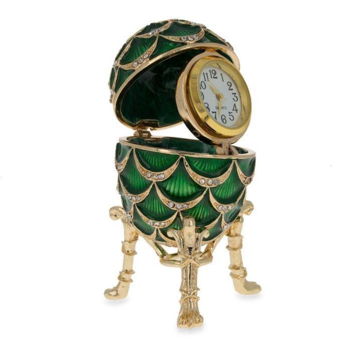 2.7" Royal Inspired Pinecone Russian Egg with Clock 2.7 Inches Tall (on a stand) x 1.6 Inches Diameter 68 mm Tall (with the stand) x 40 mm Diameter Pewter, Austrian Crystals, Enamel Hand Painted Gift Boxed Imported You'll love the elegance of this golden-hued Royal Russian egg fashioned from fine pewter. Then it is hand enameled by our skilled artisans. The egg comes with the clock inside. It opens on a hinge and has a magnetic closure to keep the box securely shut. The piece also comes in a beautiful gift box. -- Faberge Eggs have a remarkable story and while the original Faberge eggs are virtually priceless, extraordinary re-creations of Carl Faberge’s works are not only fabulous to look at but wonderful to own and collect. You ask the question, “how much would an original Carl Faberge egg cost in today’s marketâ€. Here’s a story that will give you that answer: Los Angeles Times: “A Faberge egg found at a flea market by a scrap-metal dealer who initially didn't realize the value of what he had discovered will be on public view for the first time in more than a century, according to a British art and antiques dealer. The egg, thought to have been made in the late 19th century for Russian royalty, was purchased years ago at a U.S. flea market for just $14,000, said the antiques dealer, Wartski. The buyer was interested in the item for its gold content but later suspected the piece might be even more valuable. The egg was later sold to a private collector. The identities of the buyer and seller haven't been revealed. Wartski didn't disclose how much was paid for the egg, but some estimates put its value as high as $33 million. It will be on display at Wartski in London from April 14 to 17.†The first Faberge egg was crafted for Tsar Alexander III, who had decided to give his wife, the Empress Maria Fedorovna, an Easter egg in 1885, possibly to celebrate the 20th anniversary of their betrothal. Although there is no official record of the Tsar's inspiration for it, many believe that he was moved by an egg owned by the Empress’s aunt, Princess Vilhelmine Marie of Denmark, which had captivated Maria’s imagination in her childhood and of which the Tsar was well aware. Known as the Hen Egg, the very first Faberge egg is crafted from a foundation of gold. Its opaque white enameled "shell" opens to reveal a matte yellow-gold yolk. This in turn opens to reveal a multicolored gold hen that also opens. The hen contained a minute diamond replica of the imperial crown from which a small ruby pendant was suspended, but these last two elements have been lost.[2] Maria was so delighted by the gift that Alexander appointed Faberge a "goldsmith by special appointment to the Imperial Crown" and commissioned another egg the next year. After that, Peter Carl Faberge was apparently given complete freedom for the design of future imperial Easter eggs, and their designs became more elaborate. According to Faberge family lore, not even the Tsar knew what form they would take—the only requirements were that each contain a surprise, and that each be unique. Once Faberge had approved an initial design, the work was carried out by a team of craftsmen, among them Michael Perkhin, Henrik Wigstrom and Erik August Kollin.[citation needed] After Alexander III's death on 1 November 1894, his son, Nicholas II, presented a Faberge egg to both his wife, Alexandra Fedorovna, and his mother, the Dowager Empress Maria Fedorovna. Records have shown that of the 50 imperial Easter eggs, 20 were given to the former and 30 to the latter. Eggs were made each year except 1904 and 1905, during the Russo-Japanese War.[3] The imperial eggs enjoyed great fame, and Faberge was commissioned to make similar eggs for a few private clients, including the Duchess of Marlborough, the Rothschild family and the Yusupovs. Faberge was also commissioned to make twelve eggs for the industrialist Alexander Kelch, though only seven appear to have been completed.[1] Following the revolution and the nationalization of the Faberge workshop in St. Petersburg by the bolsheviks in 1918, the Faberge family left Russia. The Faberge trademark has since been sold several times and several companies have retailed egg-related merchandise using the Faberge name. The Victor Mayer jewelry company produced limited edition heirloom quality Faberge eggs authorized under Unilever's license from 1998 to 2009. The trademark is now owned by Faberge Limited, which makes egg-themed jewellery.[4] In 2015 the owners of this trademark announced the creation of a new "Faberge" egg, one styled by them as belonging to the "Imperial Class" of eggs and therefore the first Imperial-Class egg in 100 years: the Faberge Pearl egg is to be sold in Qatar following a five-day exhibition some time in 2017. A spokesperson for the brand said it expected the egg to fetch at least two million US dollars, possibly much more. Despite its designation as "Imperial", it has no connection to Imperial Russia and instead has become closely tied to wealthy Arab ruling families of various Gulf Nations.[5] Its motif has been described as "scalloped", but the patterns of its curves and lines are also clearly derived from the girih and arabesque of Islamic interlace patterns, and each of its six vertical segments includes a stylized pointed dome and associated pendentives reminiscent of the onion dome and ceiling of an Arabic mosque. The celebrated series of 50 Imperial Easter eggs was created for the Russian Imperial family from 1885 to 1916 when the company was run by Peter Carl Faberge. These creations are inextricably linked to the glory and tragic fate of the last Romanov family. They were the ultimate achievement of the renowned Russian jewelry house and must also be considered the last great commissions of objets d’art . Ten eggs were produced from 1885 to 1893, during the reign of Emperor Alexander III; 40 more were created during the rule of his dutiful son, Nicholas II, two eac