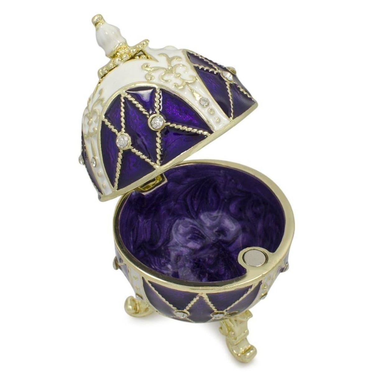 2.75" Trellis on Purple Enamel Royal Inspired Russian Easter Egg You'll love the elegance of this Faberge inspired, purple-hued, Easter egg. A display stand attached to this beauty. Fashioned from fine pewter. Then it is hand enameled by our skilled artisans. This sparkling egg is adorned with clear crystals and high-polished enamel with golden trim. It opens on a hinge and has a magnetic closure to keep the box securely shut. The piece also comes in a beautiful gift box. 2.75 Inches Tall Pewter, Crystals, Enamel Padded Satin Lined Gift Box -- Faberge Eggs have a remarkable story and while the original Faberge eggs are virtually priceless, extraordinary re-creations of Carl Faberge’s works are not only fabulous to look at but wonderful to own and collect. You ask the question, “how much would an original Carl Faberge egg cost in today’s marketâ€. Here’s a story that will give you that answer: Los Angeles Times: “A Faberge egg found at a flea market by a scrap-metal dealer who initially didn't realize the value of what he had discovered will be on public view for the first time in more than a century, according to a British art and antiques dealer. The egg, thought to have been made in the late 19th century for Russian royalty, was purchased years ago at a U.S. flea market for just $14,000, said the antiques dealer, Wartski. The buyer was interested in the item for its gold content but later suspected the piece might be even more valuable. The egg was later sold to a private collector. The identities of the buyer and seller haven't been revealed. Wartski didn't disclose how much was paid for the egg, but some estimates put its value as high as $33 million. It will be on display at Wartski in London from April 14 to 17.†The first Faberge egg was crafted for Tsar Alexander III, who had decided to give his wife, the Empress Maria Fedorovna, an Easter egg in 1885, possibly to celebrate the 20th anniversary of their betrothal. Although there is no official record of the Tsar's inspiration for it, many believe that he was moved by an egg owned by the Empress’s aunt, Princess Vilhelmine Marie of Denmark, which had captivated Maria’s imagination in her childhood and of which the Tsar was well aware. Known as the Hen Egg, the very first Faberge egg is crafted from a foundation of gold. Its opaque white enameled "shell" opens to reveal a matte yellow-gold yolk. This in turn opens to reveal a multicolored gold hen that also opens. The hen contained a minute diamond replica of the imperial crown from which a small ruby pendant was suspended, but these last two elements have been lost.[2] Maria was so delighted by the gift that Alexander appointed Faberge a "goldsmith by special appointment to the Imperial Crown" and commissioned another egg the next year. After that, Peter Carl Faberge was apparently given complete freedom for the design of future imperial Easter eggs, and their designs became more elaborate. According to Faberge family lore, not even the Tsar knew what form they would take—the only requirements were that each contain a surprise, and that each be unique. Once Faberge had approved an initial design, the work was carried out by a team of craftsmen, among them Michael Perkhin, Henrik Wigstrom and Erik August Kollin.[citation needed] After Alexander III's death on 1 November 1894, his son, Nicholas II, presented a Faberge egg to both his wife, Alexandra Fedorovna, and his mother, the Dowager Empress Maria Fedorovna. Records have shown that of the 50 imperial Easter eggs, 20 were given to the former and 30 to the latter. Eggs were made each year except 1904 and 1905, during the Russo-Japanese War.[3] The imperial eggs enjoyed great fame, and Faberge was commissioned to make similar eggs for a few private clients, including the Duchess of Marlborough, the Rothschild family and the Yusupovs. Faberge was also commissioned to make twelve eggs for the industrialist Alexander Kelch, though only seven appear to have been completed.[1] Following the revolution and the nationalization of the Faberge workshop in St. Petersburg by the bolsheviks in 1918, the Faberge family left Russia. The Faberge trademark has since been sold several times and several companies have retailed egg-related merchandise using the Faberge name. The Victor Mayer jewelry company produced limited edition heirloom quality Faberge eggs authorized under Unilever's license from 1998 to 2009. The trademark is now owned by Faberge Limited, which makes egg-themed jewellery.[4] In 2015 the owners of this trademark announced the creation of a new "Faberge" egg, one styled by them as belonging to the "Imperial Class" of eggs and therefore the first Imperial-Class egg in 100 years: the Faberge Pearl egg is to be sold in Qatar following a five-day exhibition some time in 2017. A spokesperson for the brand said it expected the egg to fetch at least two million US dollars, possibly much more. Despite its designation as "Imperial", it has no connection to Imperial Russia and instead has become closely tied to wealthy Arab ruling families of various Gulf Nations.[5] Its motif has been described as "scalloped", but the patterns of its curves and lines are also clearly derived from the girih and arabesque of Islamic interlace patterns, and each of its six vertical segments includes a stylized pointed dome and associated pendentives reminiscent of the onion dome and ceiling of an Arabic mosque. The celebrated series of 50 Imperial Easter eggs was created for the Russian Imperial family from 1885 to 1916 when the company was run by Peter Carl Faberge. These creations are inextricably linked to the glory and tragic fate of the last Romanov family. They were the ultimate achievement of the renowned Russian jewelry house and must also be considered the last great commissions of objets d’art . Ten eggs were produced from 1885 to 1893, during the reign of Emperor Alexander III; 40 more were created during the rule of his dut