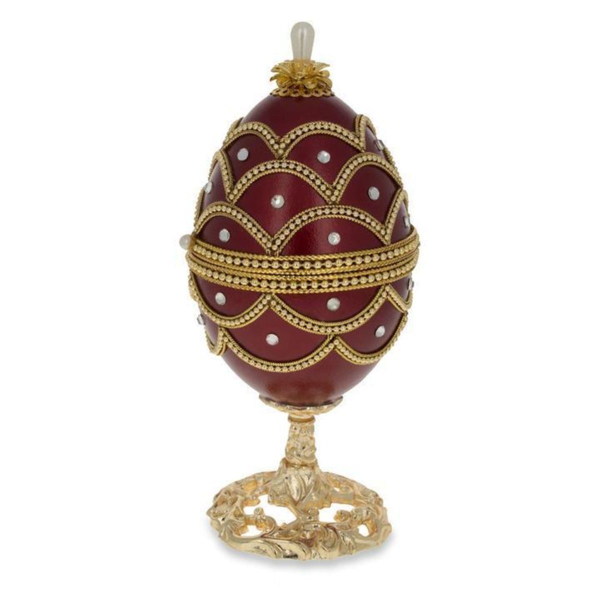 5.4" Real Eggshell Royal Inspired Russian Egg with Music Box 5.4 Inches Tall x 2.4 Inches Diameter 13.7 cm Tall x 6 cm Diameter Pewter Base Adorned with Crystals Real Eggshell Hand Painted Music Box Included Boxed The egg is made from a real eggshell with translucent burgundy enamel color, adorned with Austrian crystals and golden trim. The top opens on a hinge and has a magnetic closure to keep the box securely shut. Peter Carl Faberge is the world's most famous jeweler who created eternally original pieces of art. The series of Easter eggs created by Faberge for the Russian Imperial family, from 1885 through to 1916, is regarded as the greatest and most enduring achievement. The Faberge Easter eggs are certainly the most celebrated and inspiring of all his works of art, inextricably bound to the Faberge name and legend. They are also considered as the last great commissioned series of objects of art. -- Faberge Eggs have a remarkable story and while the original Faberge eggs are virtually priceless, extraordinary re-creations of Carl Faberge’s works are not only fabulous to look at but wonderful to own and collect. You ask the question, “how much would an original Carl Faberge egg cost in today’s marketâ€. Here’s a story that will give you that answer: Los Angeles Times: “A Faberge egg found at a flea market by a scrap-metal dealer who initially didn't realize the value of what he had discovered will be on public view for the first time in more than a century, according to a British art and antiques dealer. The egg, thought to have been made in the late 19th century for Russian royalty, was purchased years ago at a U.S. flea market for just $14,000, said the antiques dealer, Wartski. The buyer was interested in the item for its gold content but later suspected the piece might be even more valuable. The egg was later sold to a private collector. The identities of the buyer and seller haven't been revealed. Wartski didn't disclose how much was paid for the egg, but some estimates put its value as high as $33 million. It will be on display at Wartski in London from April 14 to 17.†The first Faberge egg was crafted for Tsar Alexander III, who had decided to give his wife, the Empress Maria Fedorovna, an Easter egg in 1885, possibly to celebrate the 20th anniversary of their betrothal. Although there is no official record of the Tsar's inspiration for it, many believe that he was moved by an egg owned by the Empress’s aunt, Princess Vilhelmine Marie of Denmark, which had captivated Maria’s imagination in her childhood and of which the Tsar was well aware. Known as the Hen Egg, the very first Faberge egg is crafted from a foundation of gold. Its opaque white enameled "shell" opens to reveal a matte yellow-gold yolk. This in turn opens to reveal a multicolored gold hen that also opens. The hen contained a minute diamond replica of the imperial crown from which a small ruby pendant was suspended, but these last two elements have been lost.[2] Maria was so delighted by the gift that Alexander appointed Faberge a "goldsmith by special appointment to the Imperial Crown" and commissioned another egg the next year. After that, Peter Carl Faberge was apparently given complete freedom for the design of future imperial Easter eggs, and their designs became more elaborate. According to Faberge family lore, not even the Tsar knew what form they would take—the only requirements were that each contain a surprise, and that each be unique. Once Faberge had approved an initial design, the work was carried out by a team of craftsmen, among them Michael Perkhin, Henrik Wigstrom and Erik August Kollin.[citation needed] After Alexander III's death on 1 November 1894, his son, Nicholas II, presented a Faberge egg to both his wife, Alexandra Fedorovna, and his mother, the Dowager Empress Maria Fedorovna. Records have shown that of the 50 imperial Easter eggs, 20 were given to the former and 30 to the latter. Eggs were made each year except 1904 and 1905, during the Russo-Japanese War.[3] The imperial eggs enjoyed great fame, and Faberge was commissioned to make similar eggs for a few private clients, including the Duchess of Marlborough, the Rothschild family and the Yusupovs. Faberge was also commissioned to make twelve eggs for the industrialist Alexander Kelch, though only seven appear to have been completed.[1] Following the revolution and the nationalization of the Faberge workshop in St. Petersburg by the bolsheviks in 1918, the Faberge family left Russia. The Faberge trademark has since been sold several times and several companies have retailed egg-related merchandise using the Faberge name. The Victor Mayer jewelry company produced limited edition heirloom quality Faberge eggs authorized under Unilever's license from 1998 to 2009. The trademark is now owned by Faberge Limited, which makes egg-themed jewellery.[4] In 2015 the owners of this trademark announced the creation of a new "Faberge" egg, one styled by them as belonging to the "Imperial Class" of eggs and therefore the first Imperial-Class egg in 100 years: the Faberge Pearl egg is to be sold in Qatar following a five-day exhibition some time in 2017. A spokesperson for the brand said it expected the egg to fetch at least two million US dollars, possibly much more. Despite its designation as "Imperial", it has no connection to Imperial Russia and instead has become closely tied to wealthy Arab ruling families of various Gulf Nations.[5] Its motif has been described as "scalloped", but the patterns of its curves and lines are also clearly derived from the girih and arabesque of Islamic interlace patterns, and each of its six vertical segments includes a stylized pointed dome and associated pendentives reminiscent of the onion dome and ceiling of an Arabic mosque. The celebrated series of 50 Imperial Easter eggs was created for the Russian Imperial family from 1885 to 1916 when the company was run by Peter Carl Faberge. These c