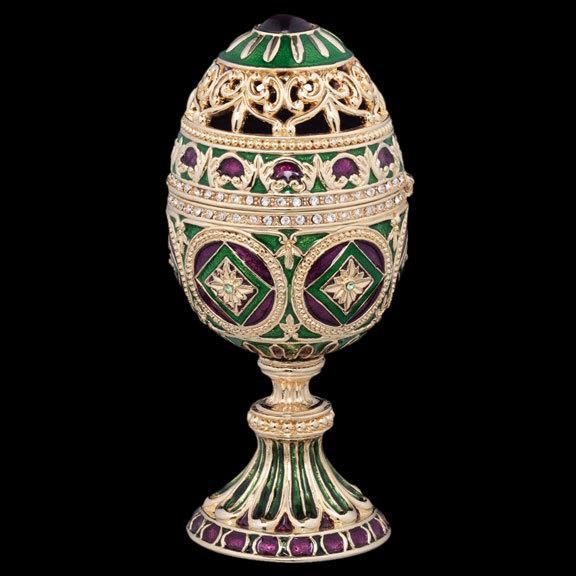 Faberge Inspired Minishka Egg. Over-the-top ornamentation characterizes these jeweler-style, museum-quality enameled eggs first made famous by Peter Carl Fabergein the 19th century. The Minishka boasts an intricate filigree of emerald and violet-hued geometrics. The Redonka lifts from its tripod base and opens to reveal a spot for tiny treasures. Both are cast in metal alloy using the ancient lost wax method and before the brilliant enamel, faux jewels and tiny embellishments are added. Dimensions: 3"W x 3"D x 5.5"H