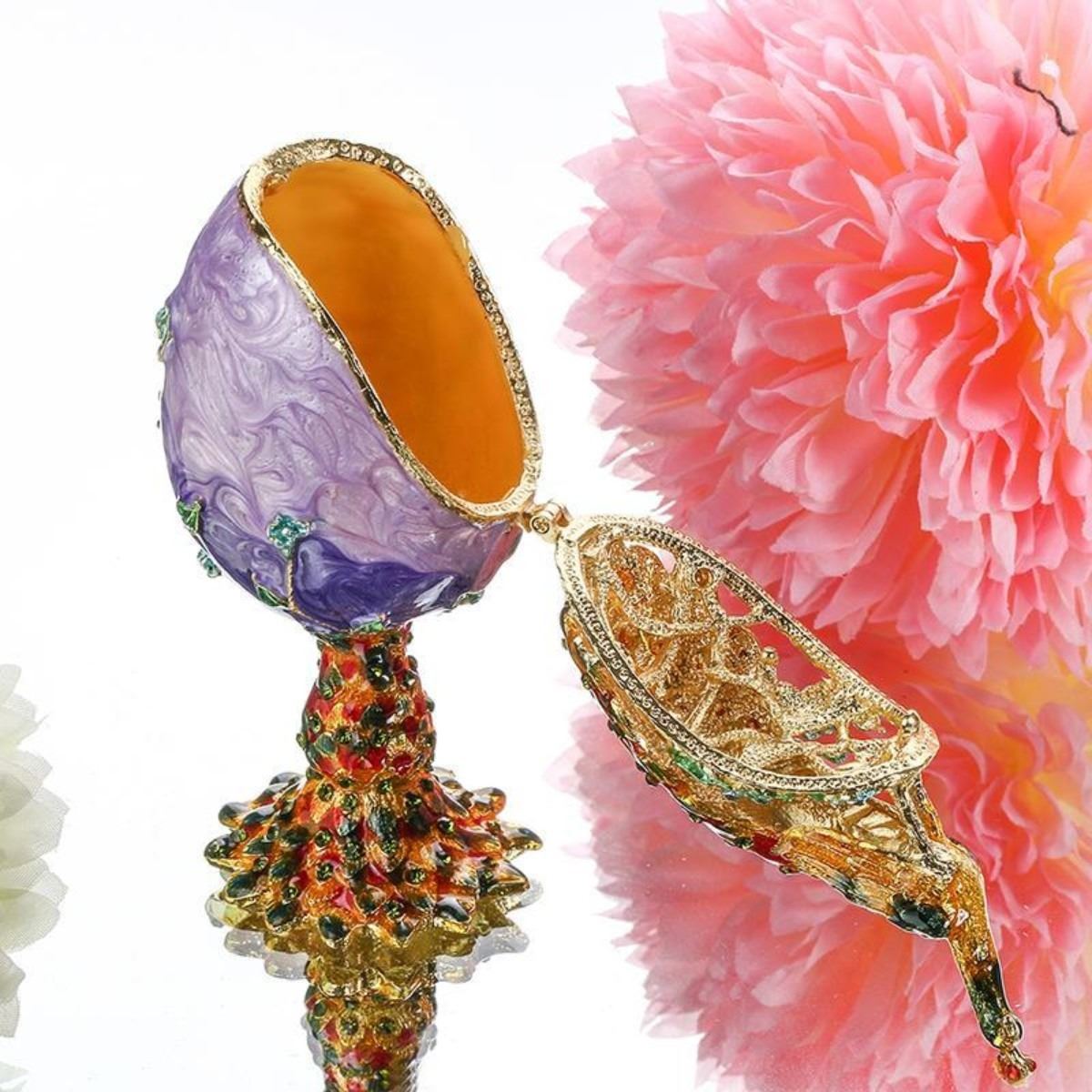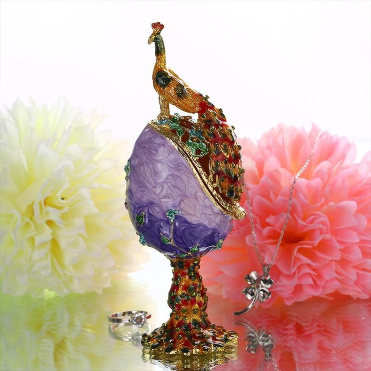 Unique Faberge Insipred Peacock Egg, with hundreds of hours of workmanship, this hand painted Peacook features some very elegant colour arrangements. We have received several compliants on the beauty of these Peacock Eggs and have now added them to our private collection. Please feel free to email us or join our mailing list for some more fabulous finds !