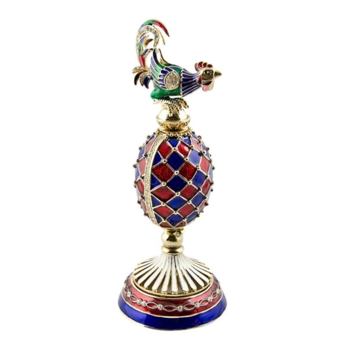 Faberge-inspired Russian ornament, decorated with a green, blue & red enameled rooster, perched atop a red & blue harlequin pattern egg. Egg opens horizontally to reveal a removable golden quartz clock inside. Enamel & gold gilt over pewter with embedded Austrian crystals. 6 1/2" H X 2 1/2" base diameter. 1 3/4" egg diameter. Comes with gift box.