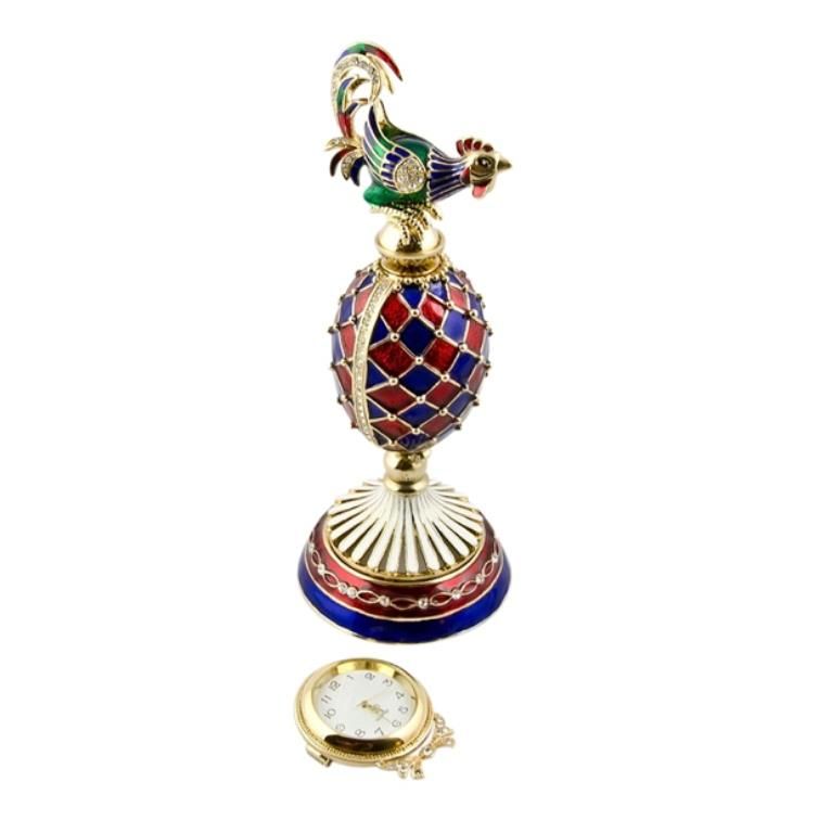 The Faberge Inspired Rooster egg is painted in deep blue and red color and ornamented with golden decor. Crystals are placed along the golden rays. The egg opens vertically to reveal a removable golden framed quartz clock inside. A colorful rooster in blue, green, and red stands on top of the egg. 6.5'' (H) X 2.5'' (Base Diameter) 1.75" (Egg Diameter) Pewter, Crystals, Enamel Faberge is a trademark of Pallinghurst Resources LLP. This piece of art should not be associated with Pallinghurst Resources LLP, Faberge Limited Co. who acquired the Faberge trademark in 2007. This item is an exacting replication of a piece of priceless value.