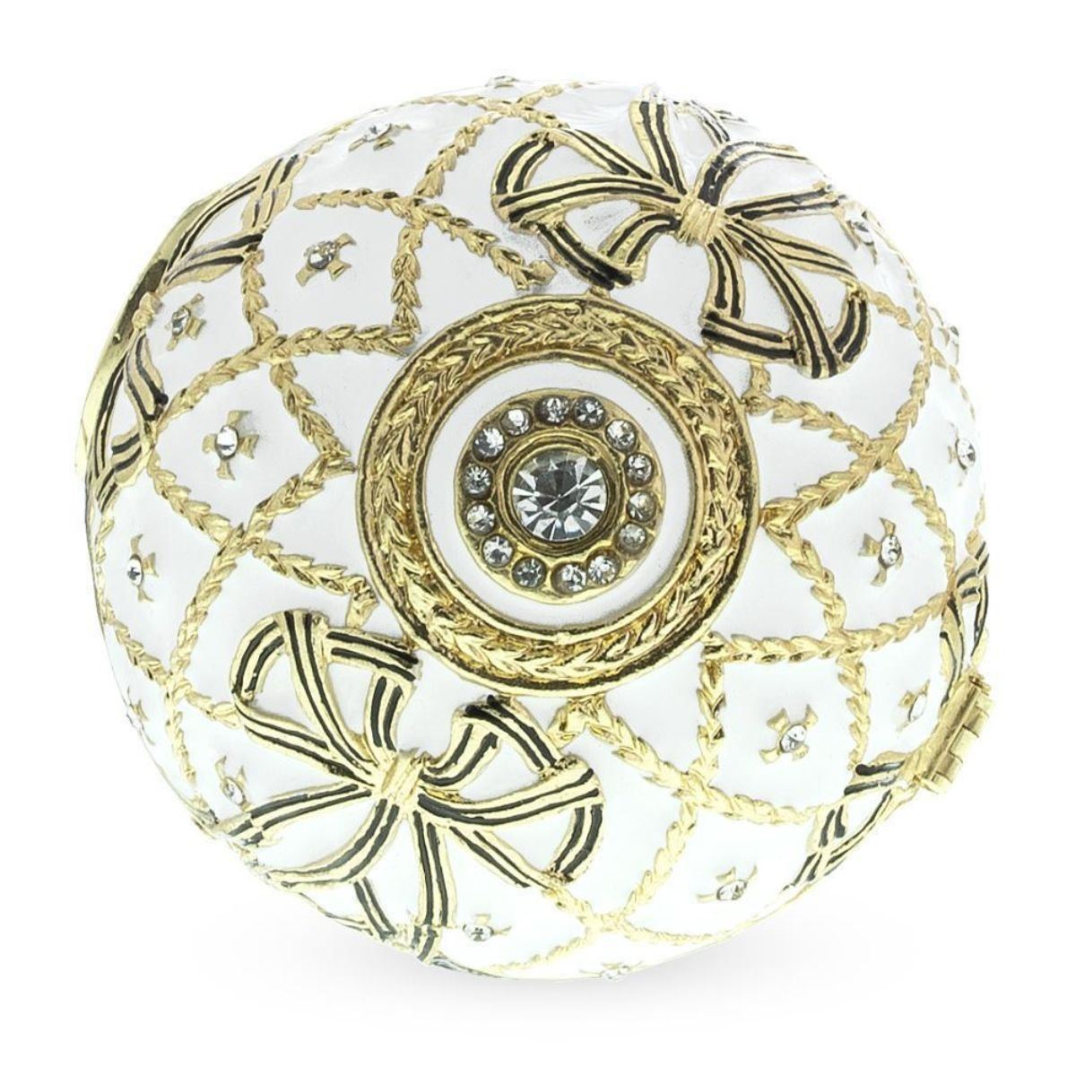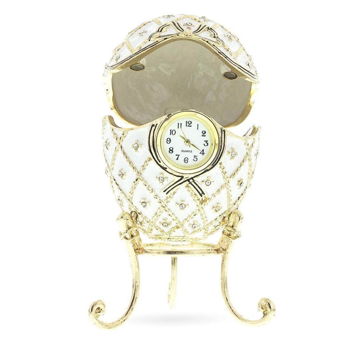 Inspired by the designs of Carl Faberge for the Russian Royal family, a re-creation of the 1916 Order of St. George Royal Russian egg, trinket, jewel box with removable quartz clock. Enamel & gilt over pewter, with embedded Austrian crystals. The egg opens in the center on a hinge to reveal an enameled interior for storing trinkets or jewels, & closes shut with a magnet. 4" H on stand X 2 1/2" W. Original Egg History: The Order of St. George Egg, also called the Cross of St. George Egg, is an enameled Easter egg made under the supervision of the Russian jeweler Peter Carl Faberge in 1916, for Nicholas II of Russia, who presented the egg to his mother, the Dowager Empress Maria Feodorovna. This was the last egg that the Dowager Empress received, as the Karelian Birch egg that was intended for her never reached her. Made during World War I, the Order of St. George egg commemorates the Order of St. George that was awarded to Emperor Nicholas and his son, the Grand Duke Alexei Nikolaievich. The Order of St. George egg, and its counterpart the Steel Military egg were given a modest design, in keeping with the austerity of World War I.
