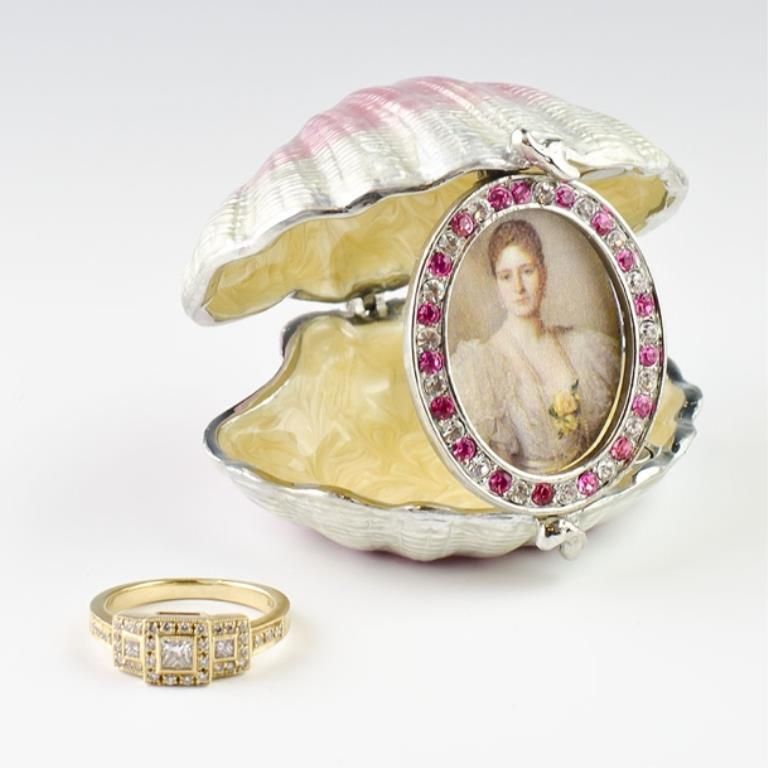 This jewelry box contains hidden picture frame. Frame Opening Dimensions: 2.5'' (D) Pewter, Crystals, Enamel Faberge is a trademark of Pallinghurst Resources LLP. This piece of art should not be associated with Pallinghurst Resources LLP, Faberge Limited Co. who acquired the Faberge trademark in 2007. This item is an exacting replication of a piece of priceless value.