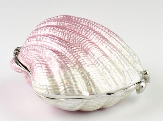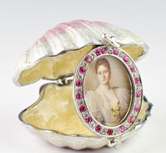 Faberge Inspired Shell Picture Frame ?Frame Opening Dimensions: 2.5'' (D) ?Pewter, Crystals, Enamel ?Gift Boxed This jewelry box contains hidden picture frame.