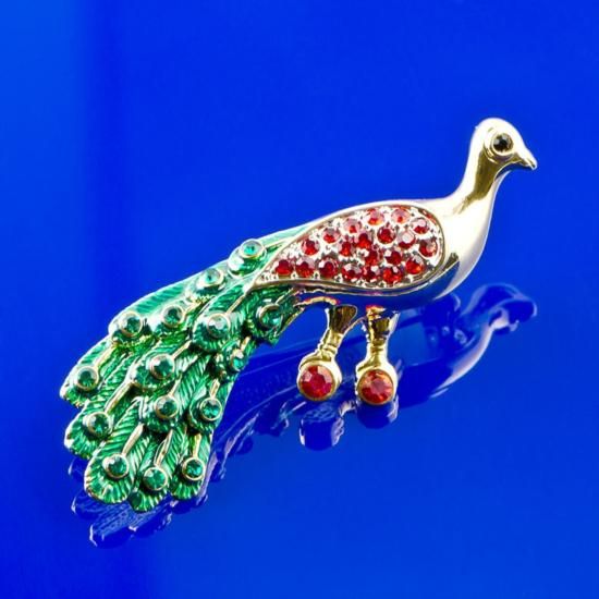 Faberge Long Tail Peacock Brooch, Dimensions: 2in (D), Material: Pewter, Crystals. The brooch is an absolute sparkling beauty with colored crystals all over.