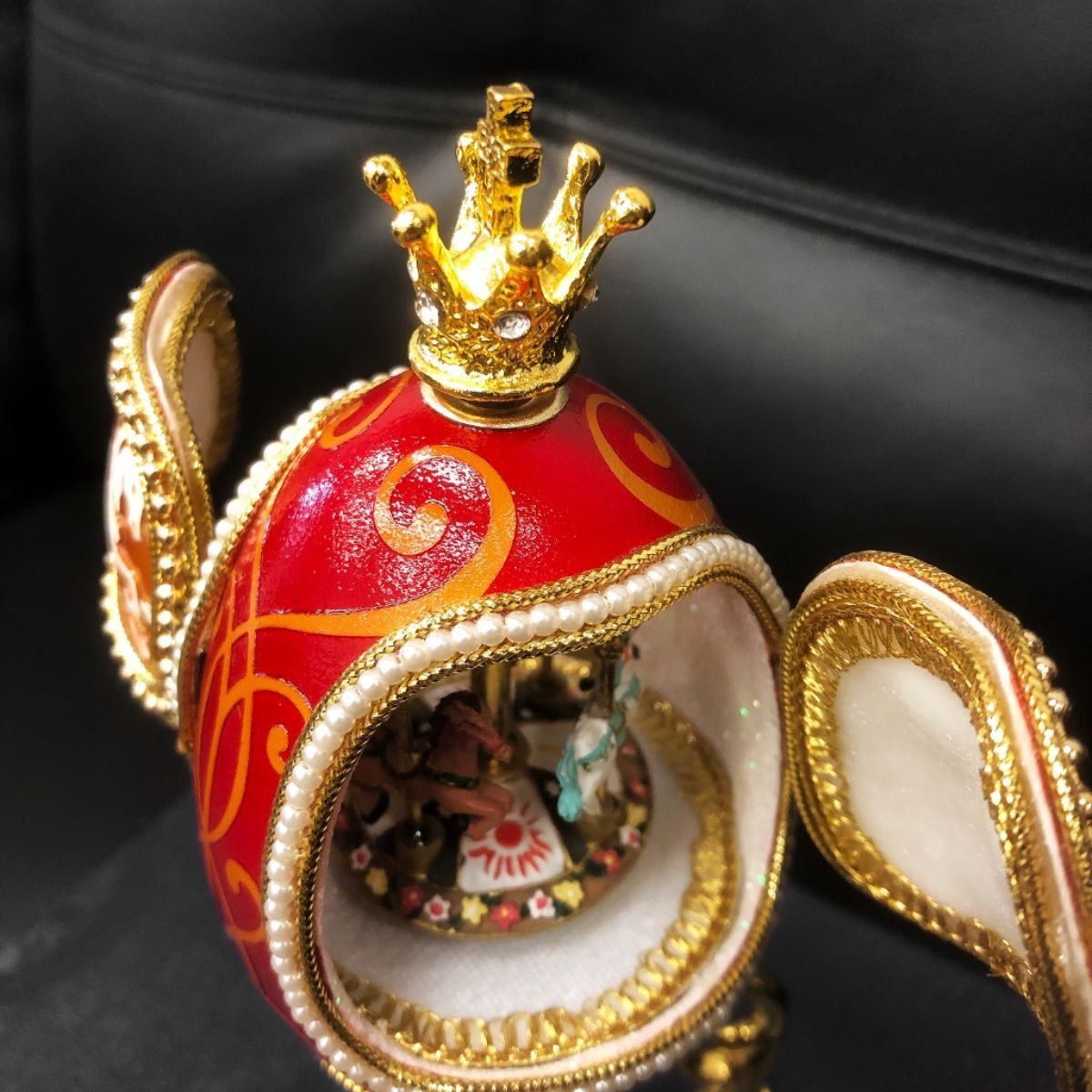 A Merry Go Round Faberge Egg In Navy Box. This Display Piece Winds Up And the Merry Go Round Rotates To The Music. Doctorate Front and Rear Door That Opens To Display The Revolving Horses Inside.